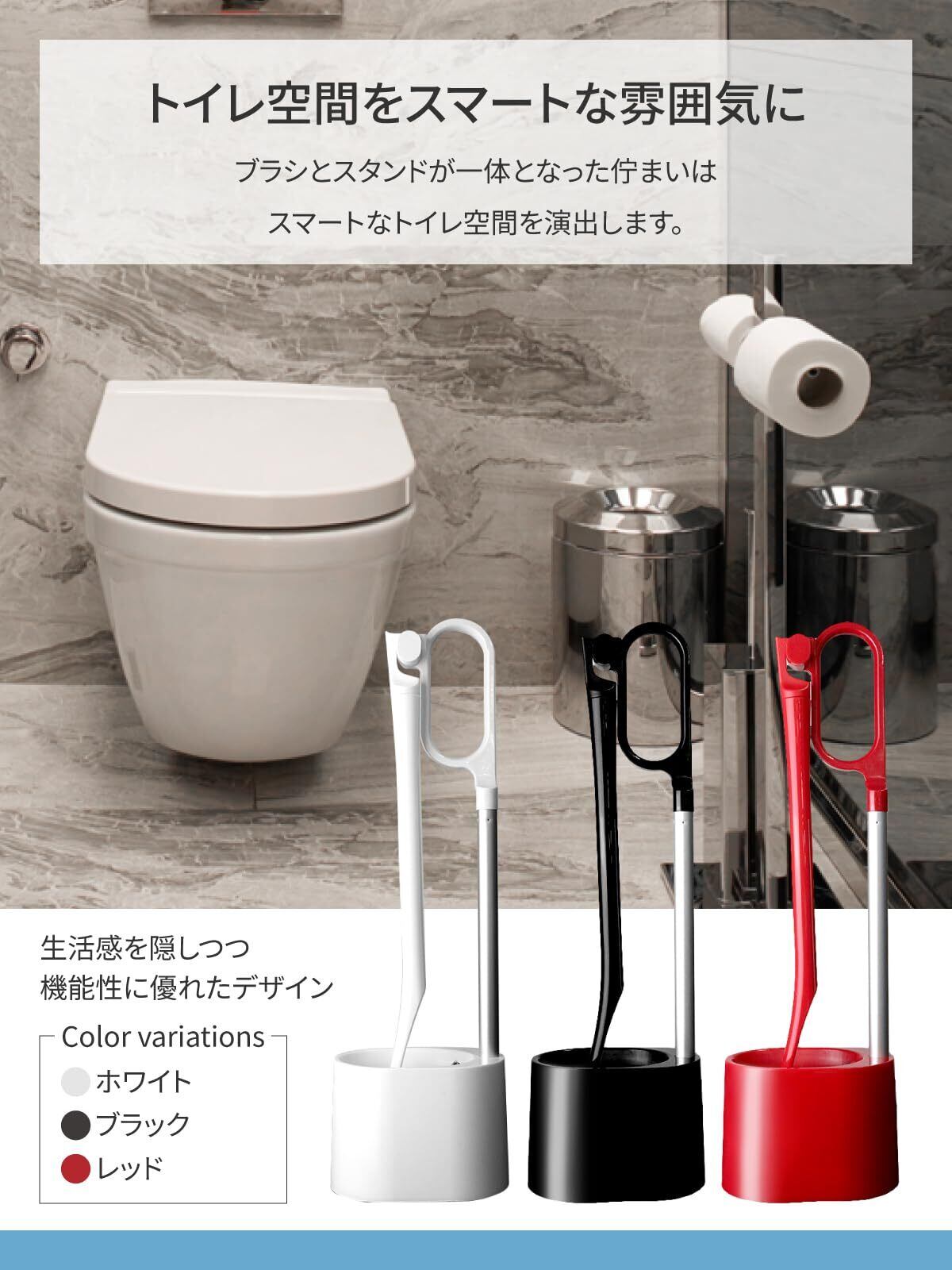 【スマートなトイレ空間を演出】複雑な便器のフォルムにフィットするようにていねいに設計されたブラシヘッド。 ブラシとスタンドが一体となった佇まいは、スマートなトイレ空間を演出します。