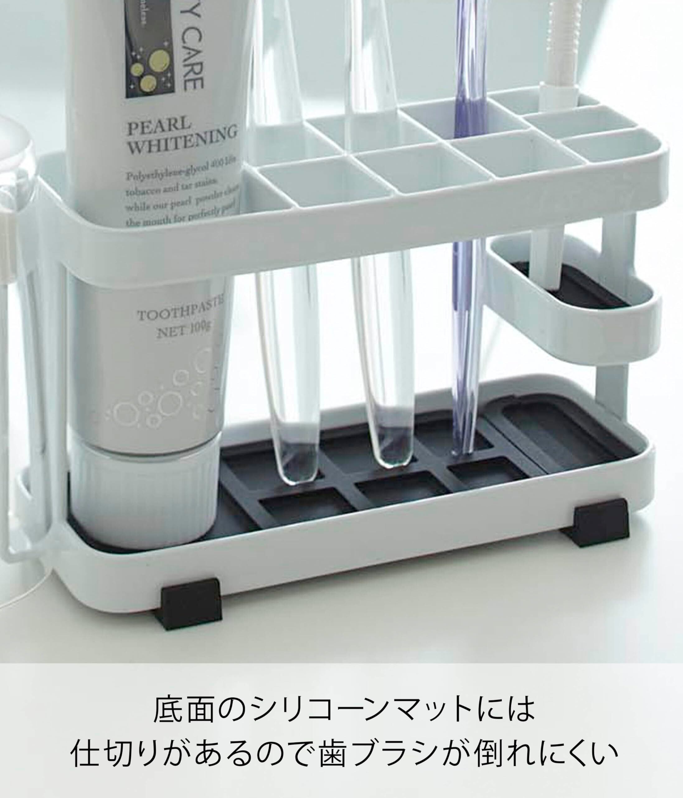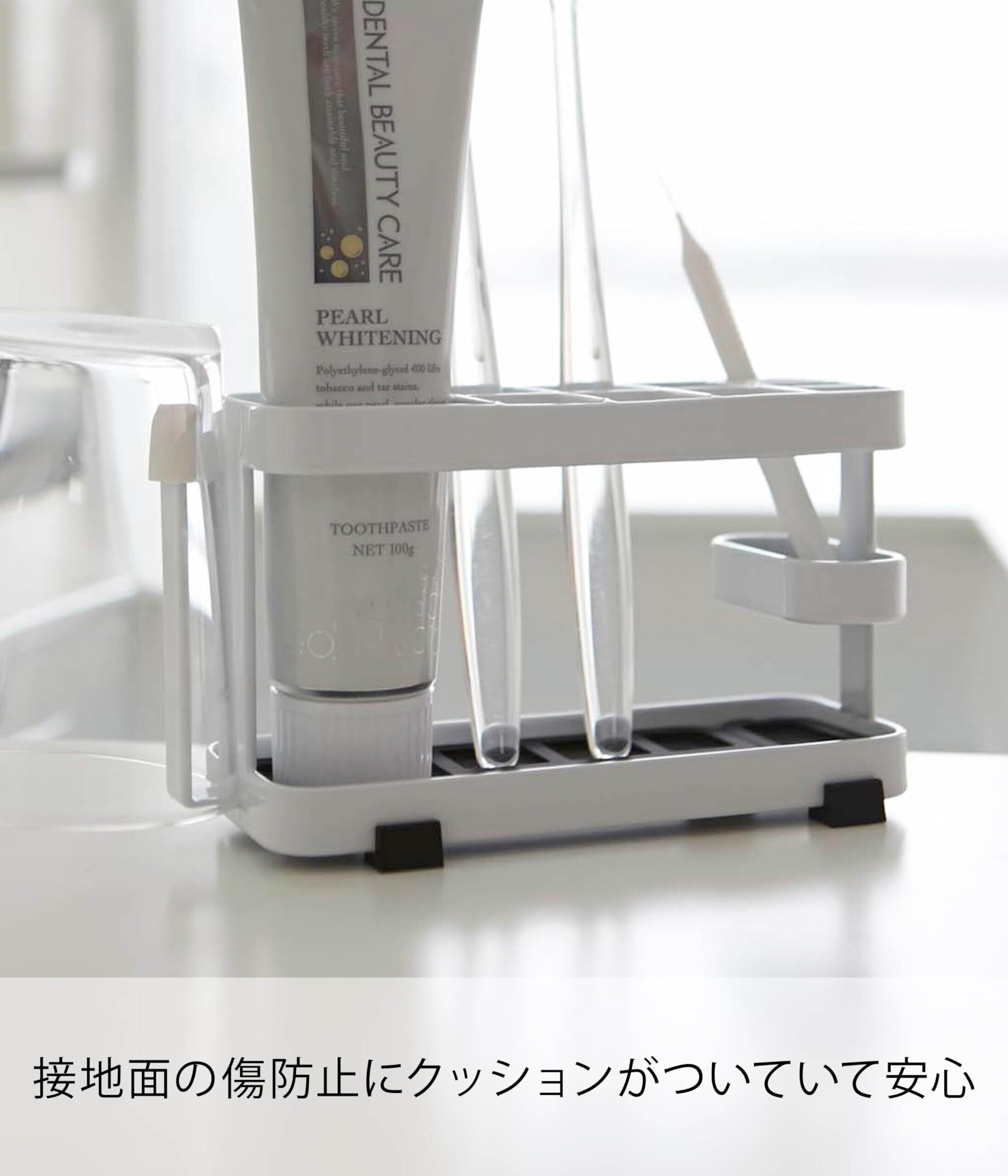歯ブラシ・歯間ブラシ・歯磨きチューブ・タンブラーを一括収納! 歯ブラシ6本・歯間ブラシ3本・歯磨きチューブ・タンブラーを収納できます。シンプルな設計でお手入れしやすく、いつも清潔に使用できます。接地面の傷防止にクションがついていて安心。