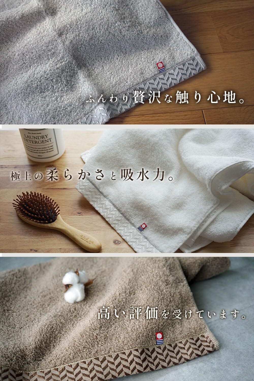 【 柔らかくしなやかなロングパイルには甘撚り糸を100%使用 】 高い吸水性を持つ甘撚り糸を使用し、ロングパイルにすることにより心地よい風合いと肌触りを実感していただけます。非常に高い吸水性でかつ満足の行くボリューム感 に仕上げております。