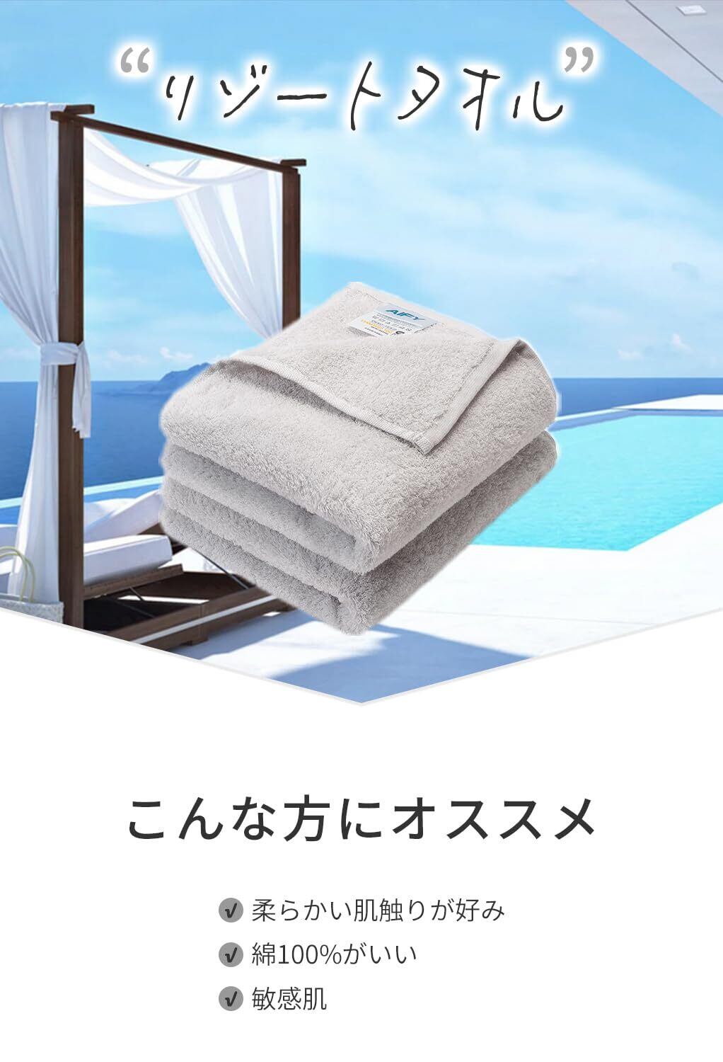 【驚きの吸水力&速乾性|リゾート気分のやわらかさ】AIFYの「リゾートタオル」フェイスタオルは、無撚糸ならではのふんわり感と吸水力が自慢。わずか1秒で“スッ”と水分を吸収し、洗顔後もお風呂上がりもすぐにさらっと快適。厚手なのに軽く、部屋干しでもすぐ乾くから、毎日の使いやすさも抜群です。
