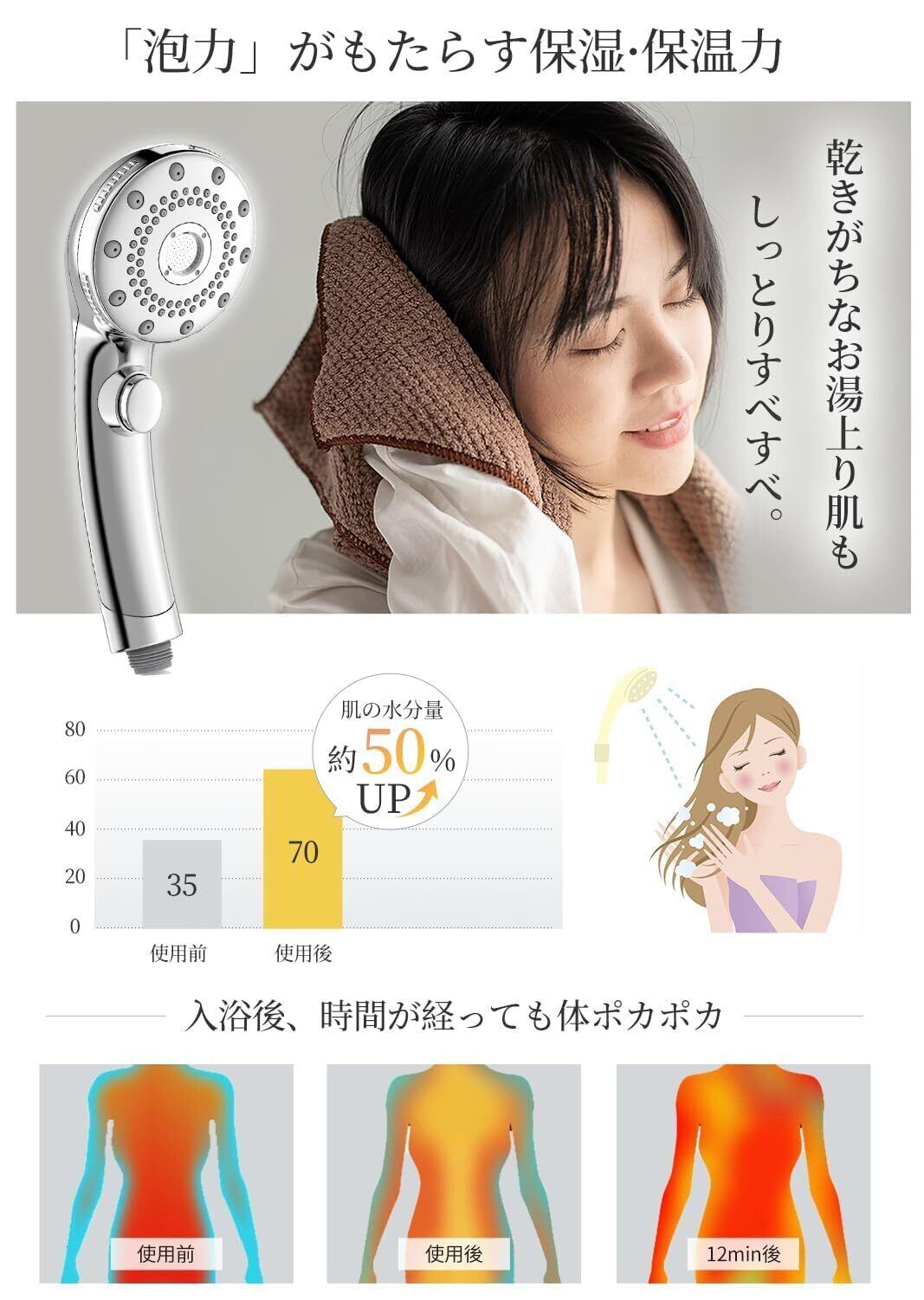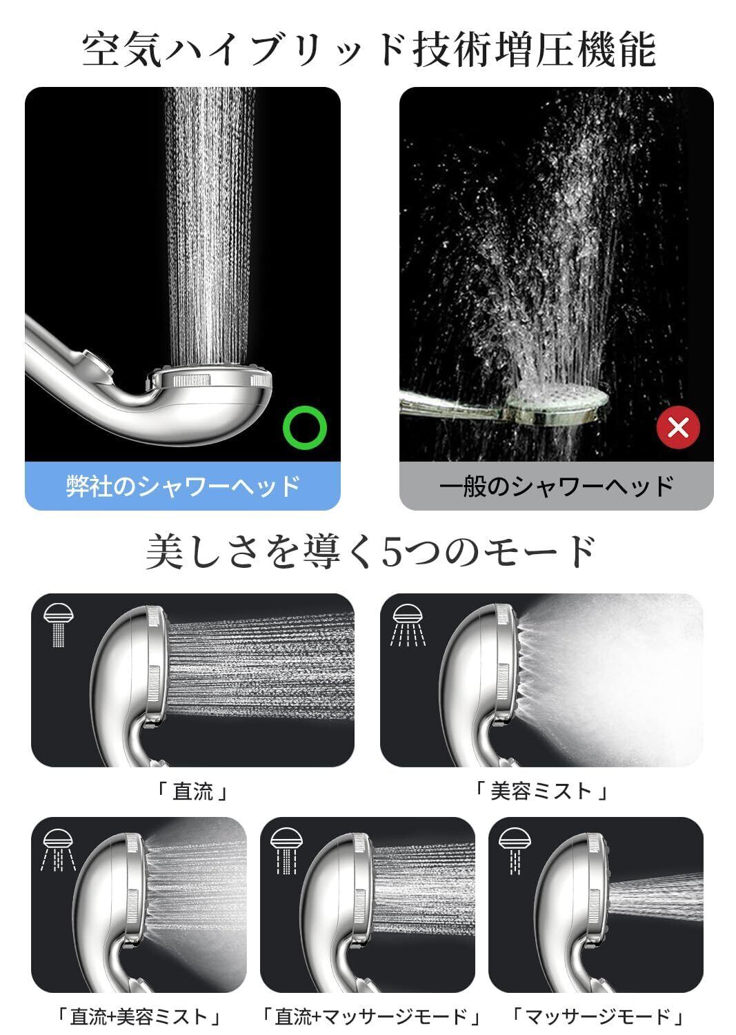 【水圧アップ&快適シャワー】空気力学を活用した独自設計で水圧を強化。高層階や低水圧環境でも安定した水流を提供し、快適な使用感を実現。微細ミストがデリケートな肌をやさしく洗い流します。