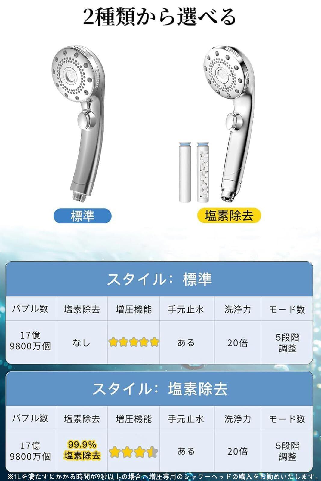 【2種類の選択肢&用途に合わせた機能】塩素除去フィルター付きの『塩素除去』タイプと、シンプルで使いやすい『標準』タイプの2種類をご用意。それぞれのニーズに合わせたシャワー体験をお楽しみいただけます。塩素除去タイプは塩素除去機能で肌や髪にやさしく、より健康的で美しい肌を目指す方にぴったり。標準タイプは軽量かつシンプル設計でどなたにもおすすめです。