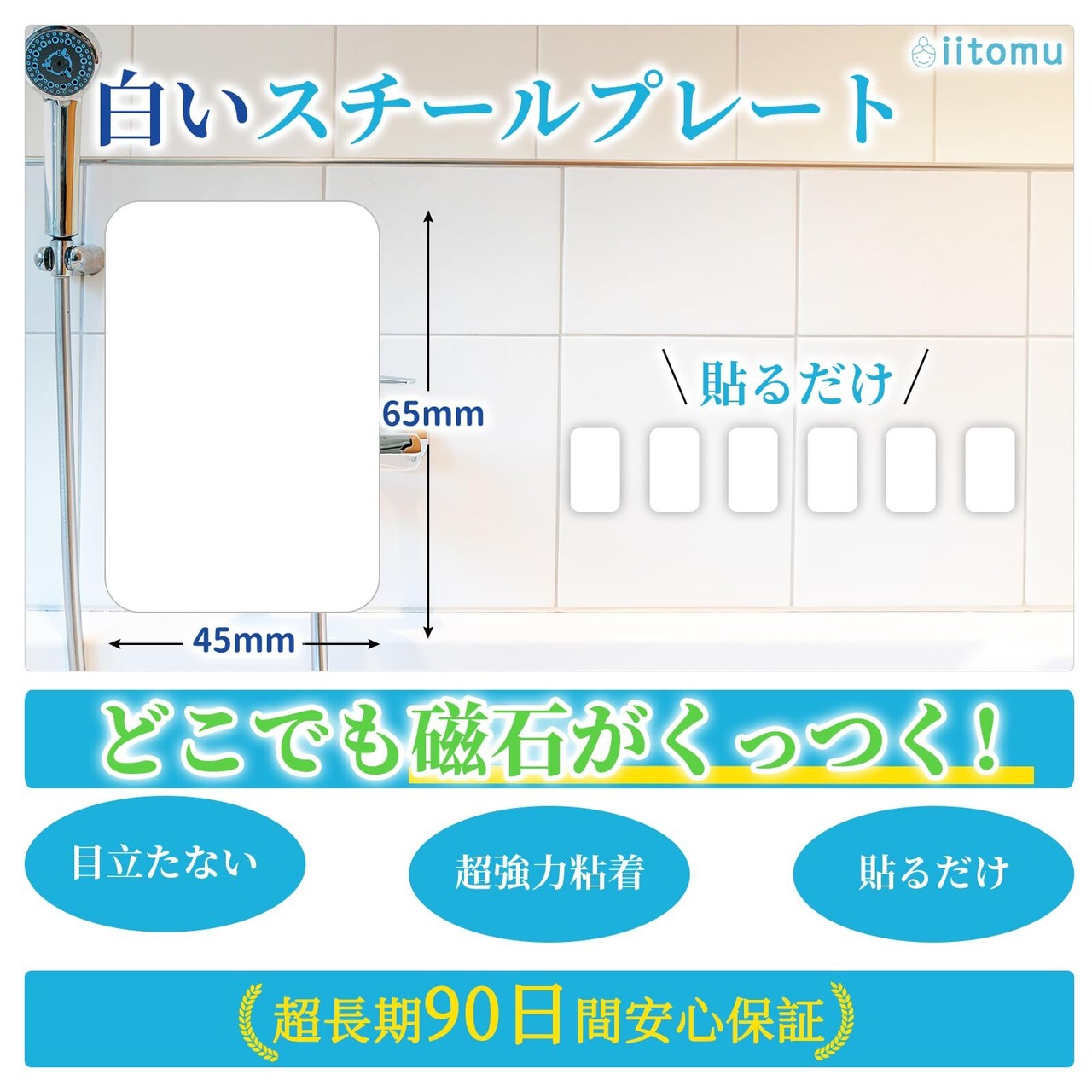 【壁に馴染みやすい白・簡単設置】:白いスチールプレートが空間に自然に溶け込み、浴室やキッチンの雰囲気を損ないません。貼るだけで、どこでも磁石が使える便利なスペースに。