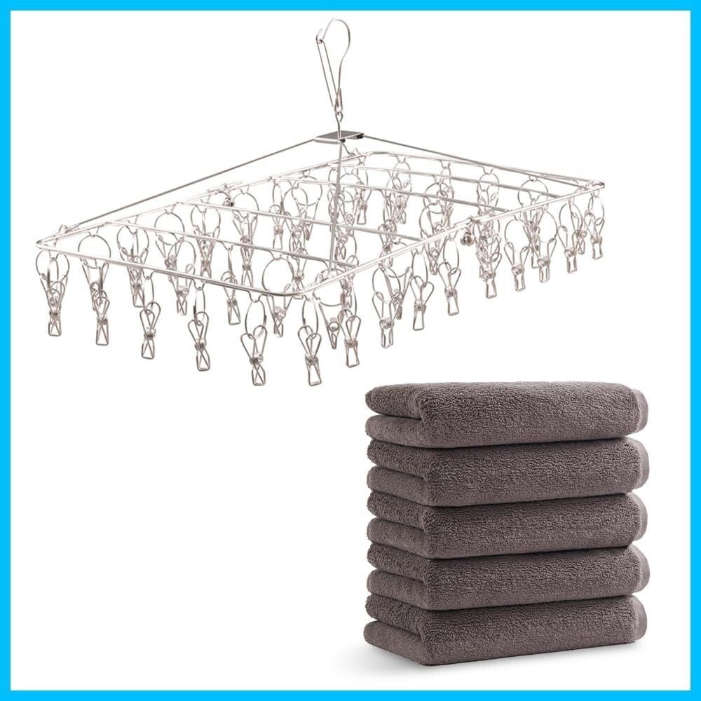アイリスオーヤマ ステンレスピンチハンガー 50ピンチ 洗濯ハンガー オールステンレス サビにくい 室内外両用 落ちにくい 回転式 PIH-50SH×アイリスプラザ フェイスタオル 5枚セット チャコール 綿100% 34×80 タオル