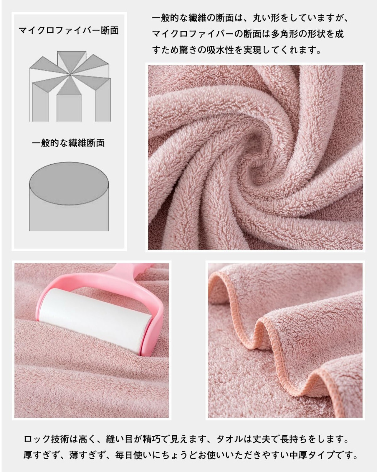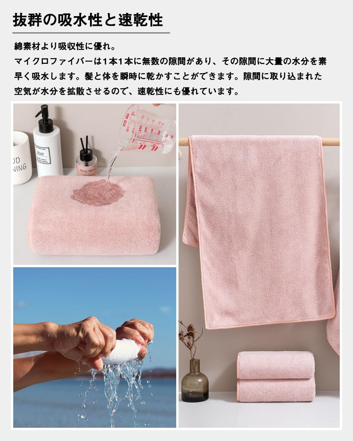 【吸水性・速乾性に優れ】綿の素材より吸水性が優れます。マイクロファイバー素材の表面は数えられない隙間があり、その隙間に大量の水分を素早い吸水できます。髪や肌にそっと当てるだけで水分が吸収される素材であり、また汚れも落としやすい特徴があります。隙間に取り込まれた空気が水分を拡散させるので、速乾性のポイントで、バスタオルの雑菌を抑え、健康を保つことができます。