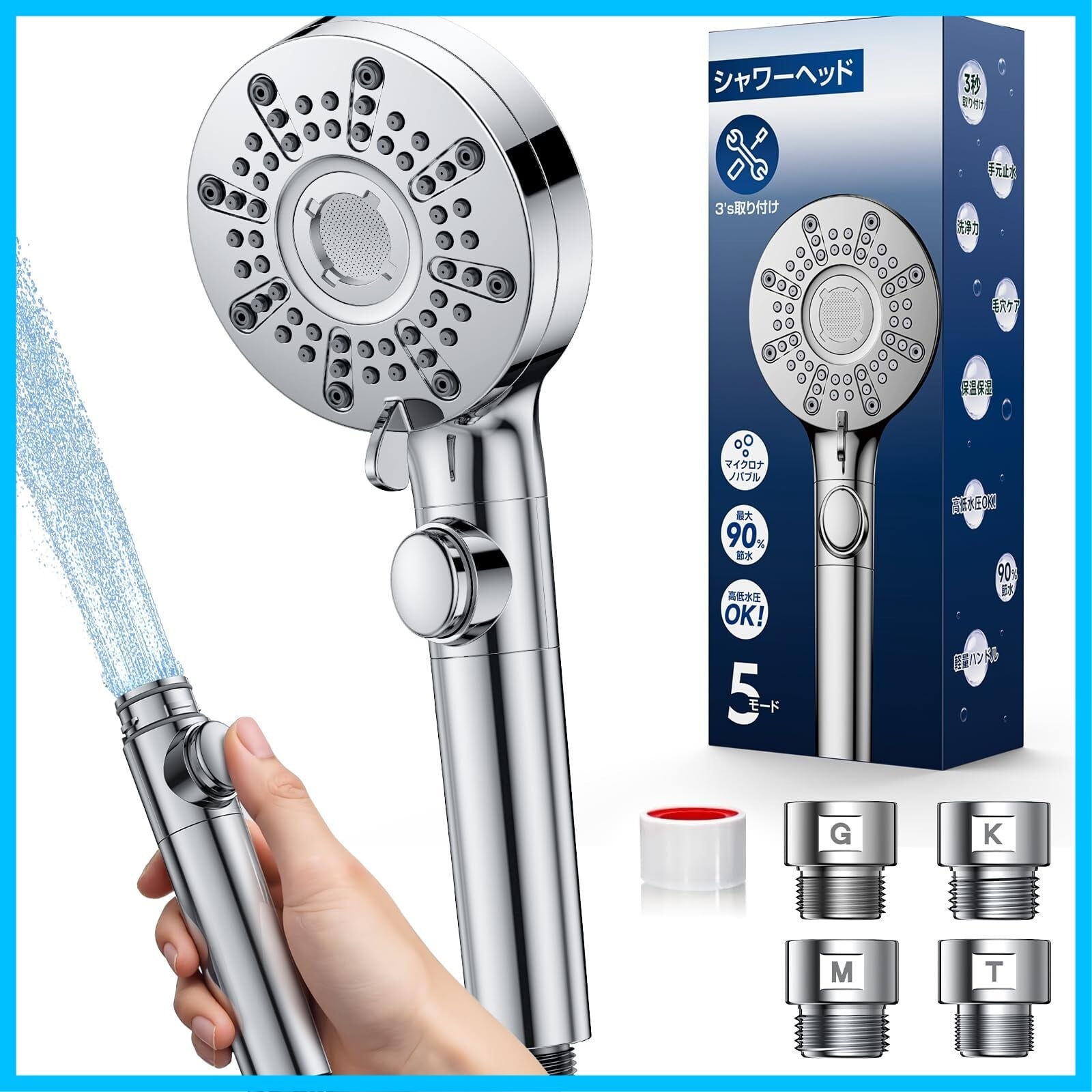 特徴 高水圧,90%節水,5段階調整,手元止水,マイクロナノバブル,簡単取り付け,浴室掃除対応