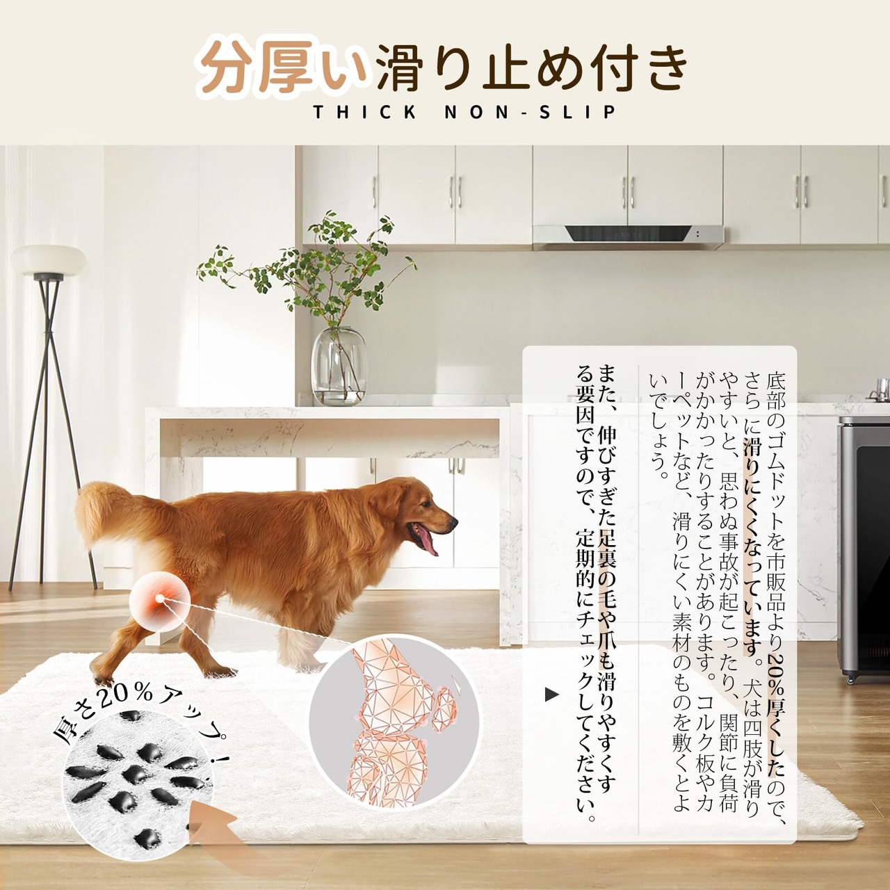 【滑り止め20%アップラグ】お子様や高齢者、ペットのいるご家庭の安全を確保するために、特別にゴムドットの厚みを強化しました。これにより、高齢者がカーペットの上を歩く際に滑る心配をせずに安心して歩けるようになり、お子様が遊ぶ際もより安全に走り回ることができます。また、犬が膝蓋骨脱臼を起こして動物病院に行く回数も減らすことができます。