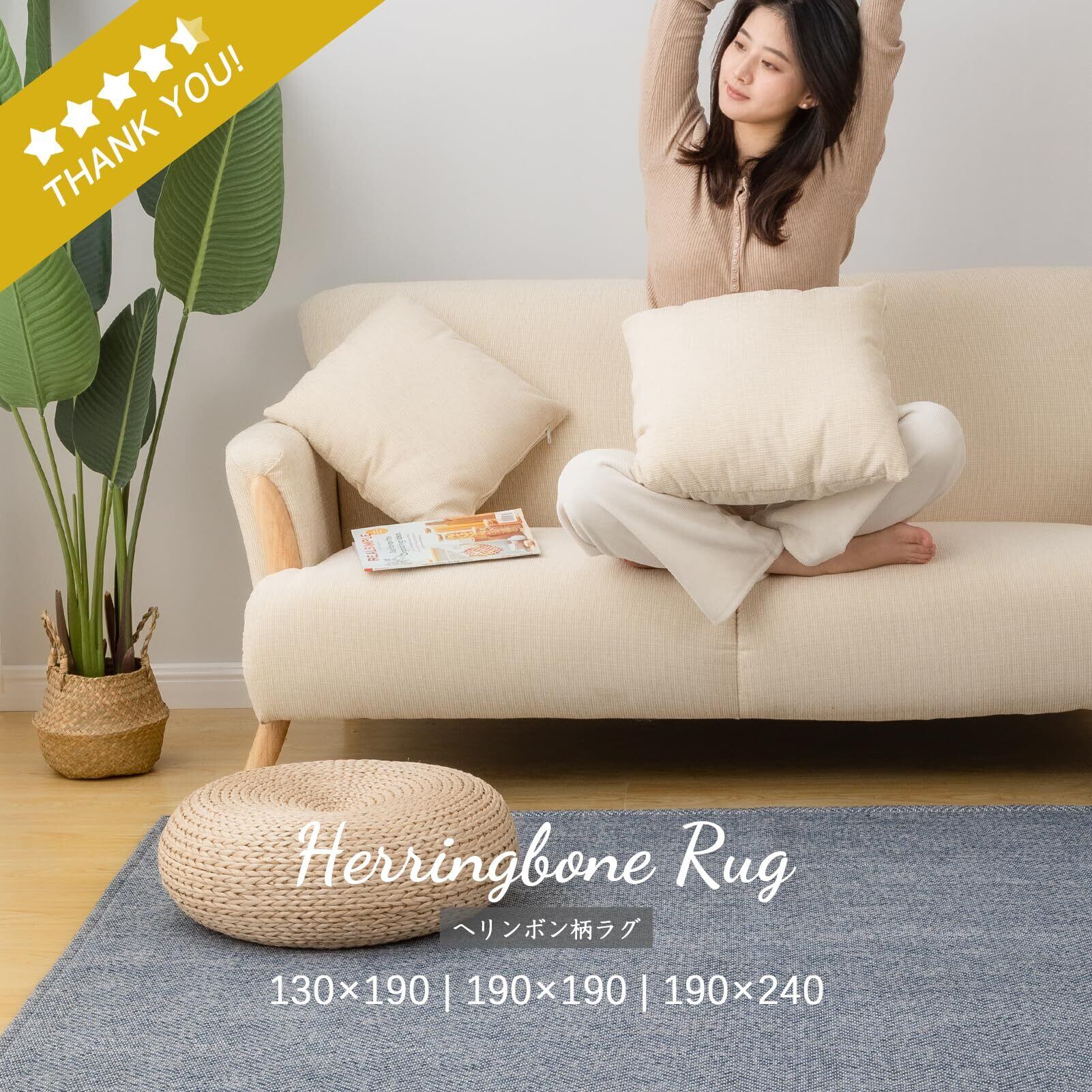 【可愛い編み地模様】こちらのラグは白系の色糸を横に、同色系の色糸を混ぜて、縦に編むことで、立体感のあるヘリンボンに仕上げました。色糸の配分によって立体的なグラデーションに。インテリアの邪魔をせず、どんなお部屋にも馴染みやすいので、いろいろなスタイルを楽しみたい方にも長く愛用していただけます。ペットもお気に入りの一枚です。さらに、ペットが引っ掻いても壊れにくい非常に丈夫な作りになっていますので、安心してご使用いただけます。