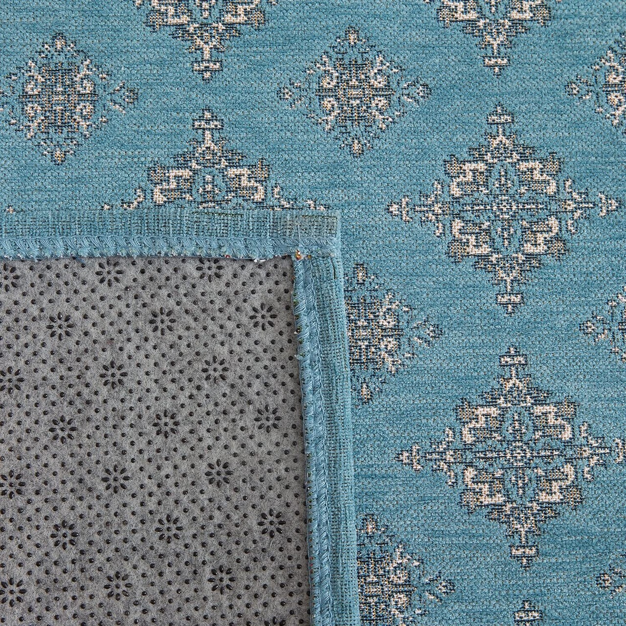 サイズ:60x90cm 二重織り 端部の厚み:10mm 平織り平面の厚み:5mm 表地:ポリエステル95% コットン:5% 裏地:ポリエステル100%(滑りにくい加工) 機能:デコレーション、滑り止め、防音、吸水、保温、抗菌除臭、防ダニ、オールシーズン対応