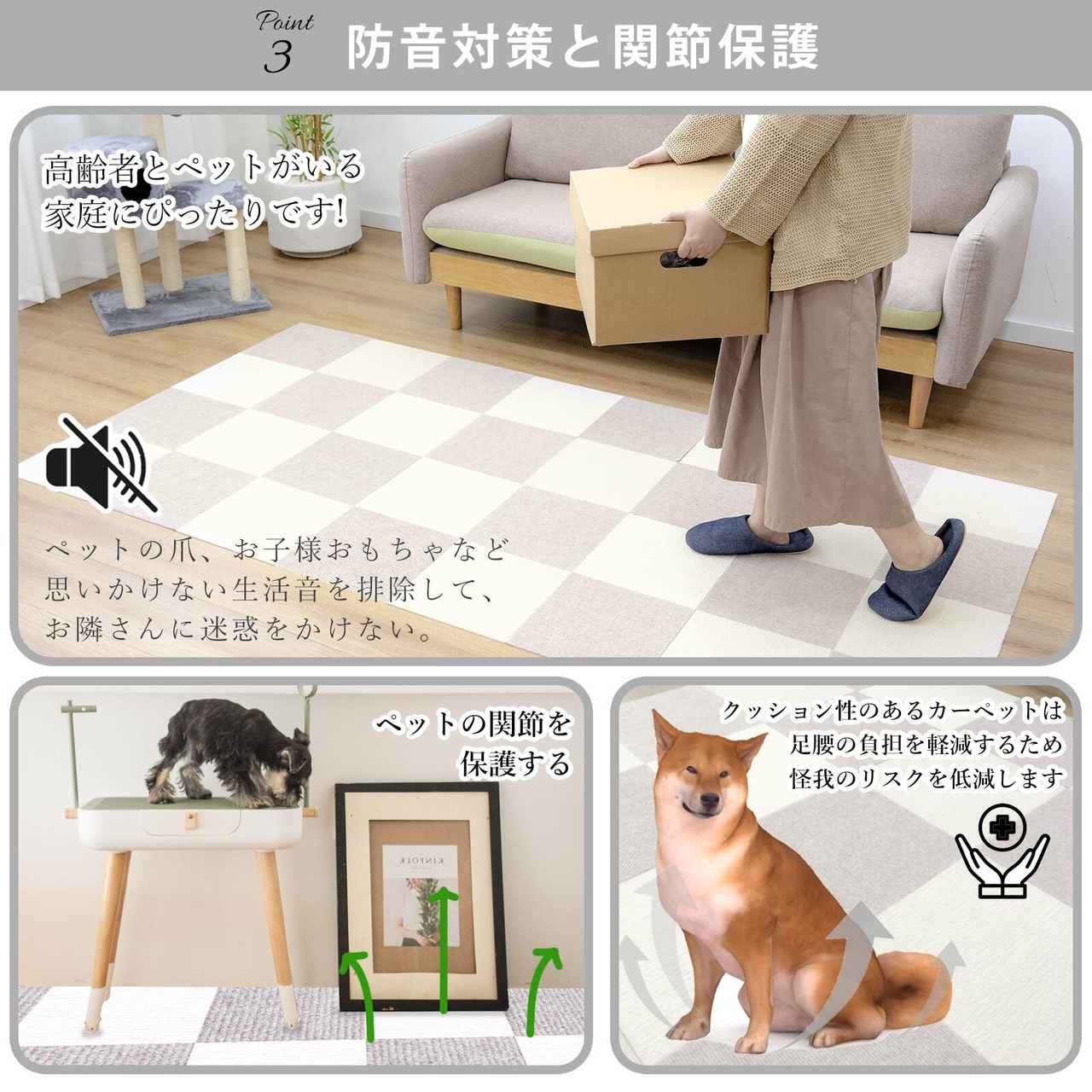 4.【自由カスタマイズ、部屋にぴったりのサイズに】このペット カーペットは部屋のスペースに合わせて必要な枚数を組み合わせるだけで設置完了し、接着剤などは一切必要ありません。さらにハサミで簡単にカットしてカスタマイズできるため、部屋の隅や壁際などの場所にもぴったり敷き詰めることができます。様々な色バリエーションがあるので、ご自身の好みに合わせて自由に組み合わせてください。