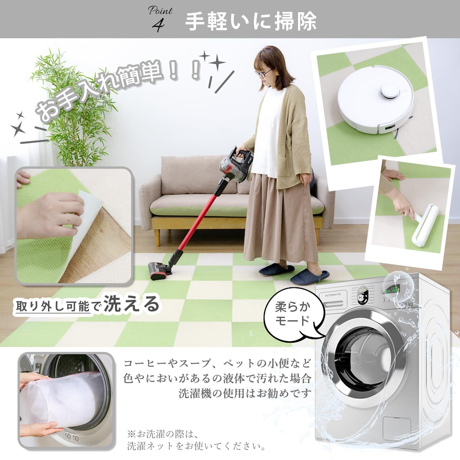 3.【ラクラク掃除、いつでも清潔を維持】このタイルマットは裏面の吸着効果でめくれ上がることがなく、掃除機やロボット掃除機にも対応しているのでお手入れが簡単です。汚れた部分だけを外して洗うことも可能で、手洗いやスポンジを使った洗浄が特に効果的です。※洗濯機での洗濯はお勧めできません