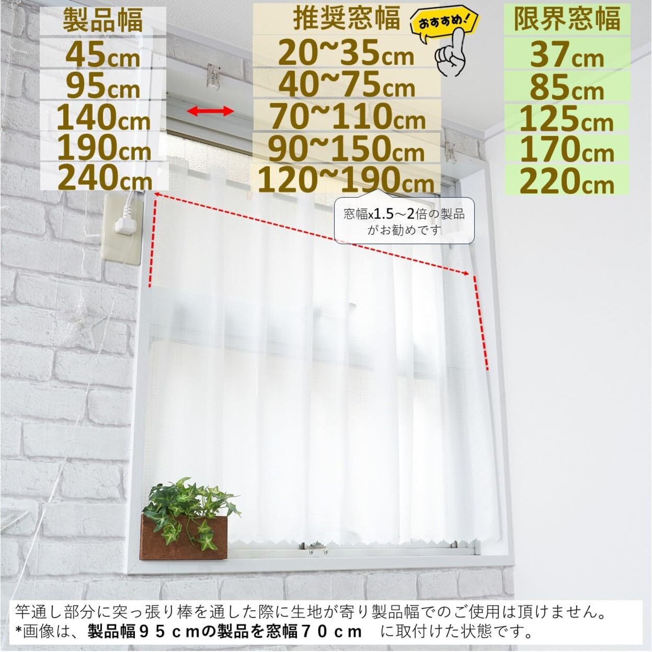 【商品特徴】 小窓やカラーボックスなどの目隠しにピッタリ。突っ張り棒で簡単に取り付け可能です。*カーテンフックでの取り付けはできません。