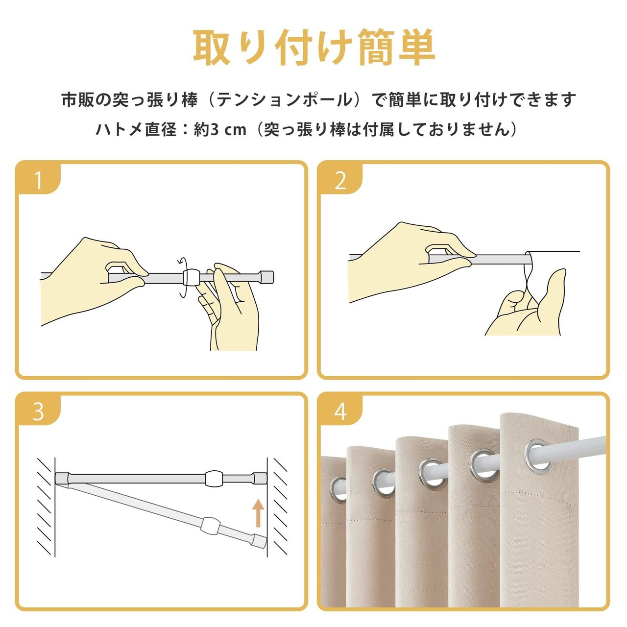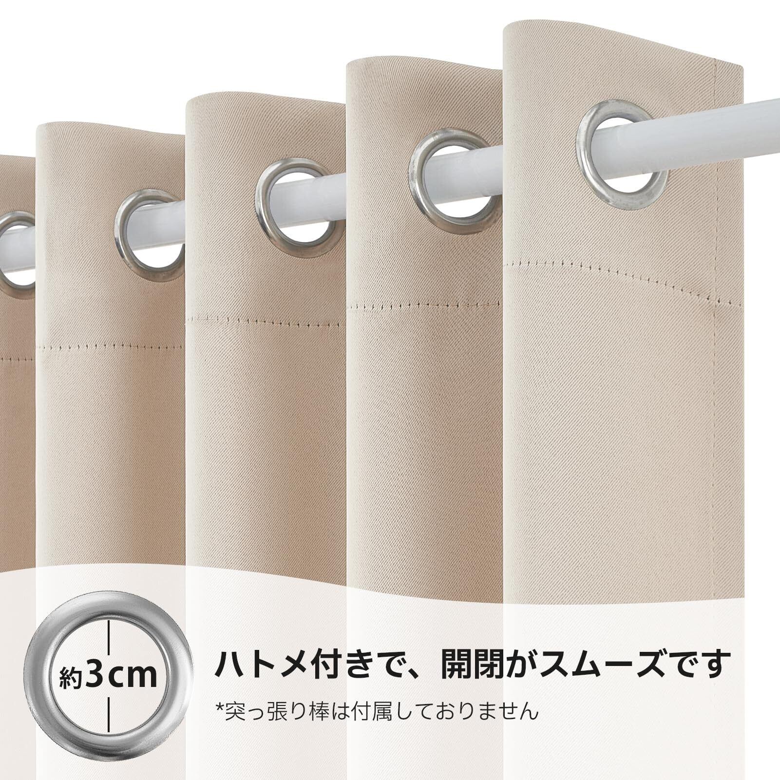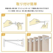 【取り付け簡単】ハトメ付きで、開閉がスムーズです。両端の直径3cm以下の突っ張り棒に対応し、通すだけで簡単に取り付けられます。(突っ張り棒は付属しておりません)