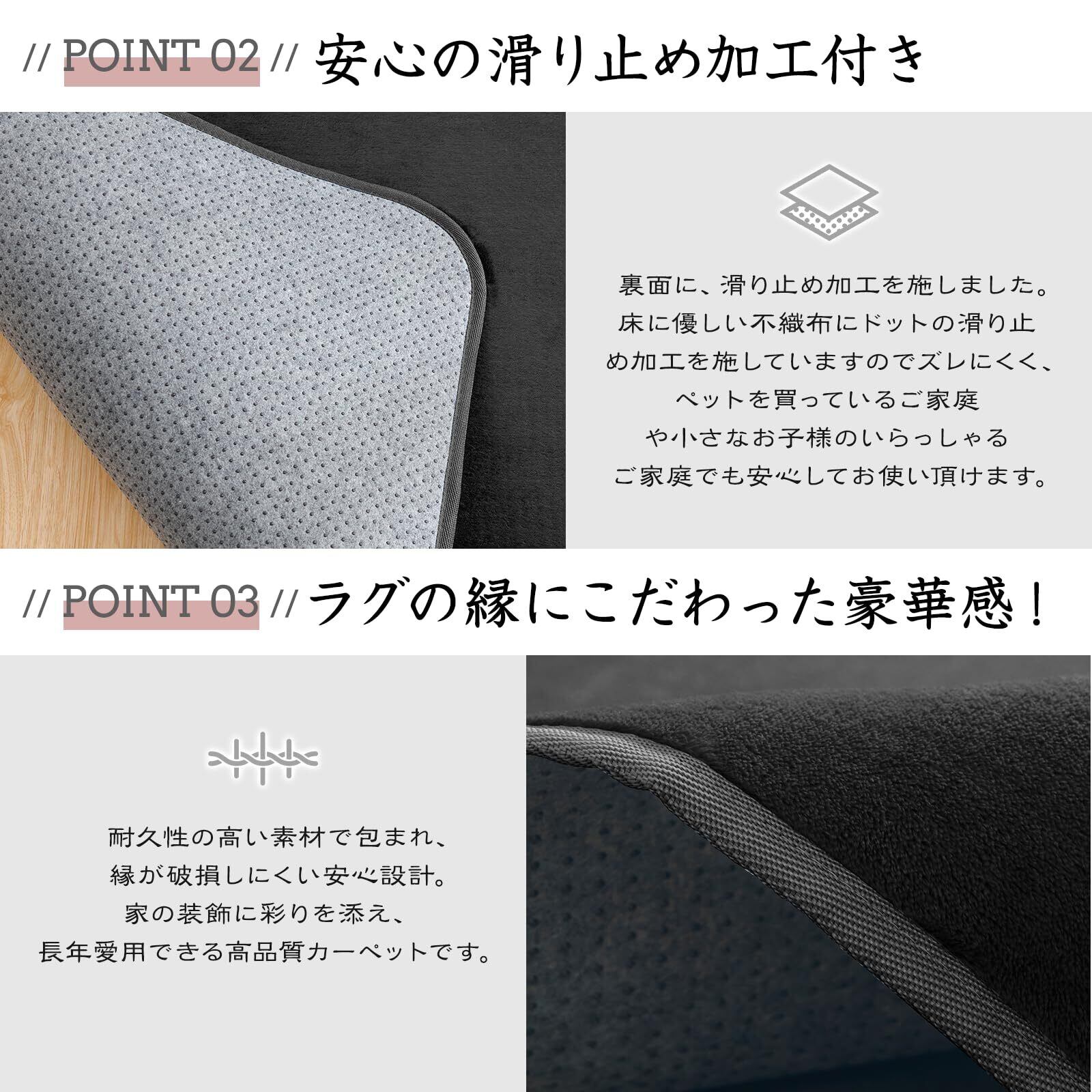 【ラグマット仕様・注意事項】サイズ:約135×185cm (約 1.5畳) 起毛の高さ:約4mm、ウレタン厚:約6mm、不織布と滑り止め加工は約1mm 表地:フランネル素材(ポリエステル100%) 裏地:不織布(ポリエステル100%・滑り止めドット付き)中材:ウレタンフォーム 【ご注意】商品輸送の際に折りたたんでお届けするため、開封時に折りジワ、歪み・寸法不足等の変形がありますが、約1週間ほどご使用になれば、ゆっくりと回復します。ラグサイズに個体差があるため表記サイズより1~3%の誤差がある場合がございます。モニターの発色の具合によって実際のものと色が多少異なる場合があります。また、生産ロットによりお色味の差が出る場合がございます。複数ご注文いただいた場合は、お色味が揃わない可能性がございます。【品質保証】ご使用中に何か問題があれば、弊社にご連絡いただければ迅速に対応いたしますので、安心してお買い求め頂けます。