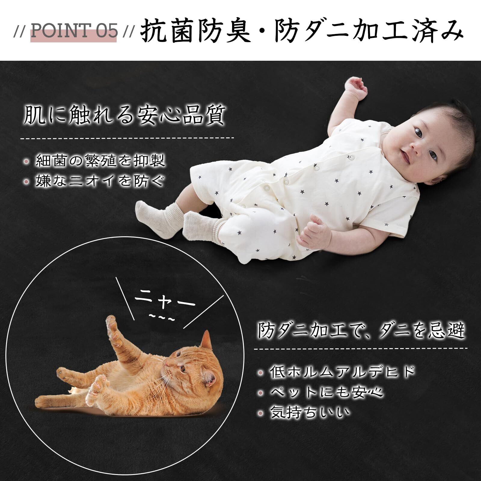 【抗菌防臭・安全安心】肌が直接触れるラグだからこそ、安心してお使いいただけるように菌の繁殖や、臭いを抑制する抗菌·防臭加工とダニの繁殖を抑制する効果のある防ダニ加工を施しています。当社の製品は薬剤等を使用して様々な加工を施しておりますが、身体に害になるような過剰な加工は、一切しておりません。低ホルマリン基準をクリアした当社の製品はアレルギーが気になる方やお子さまがいる家庭でも安心してお使いいただけます。