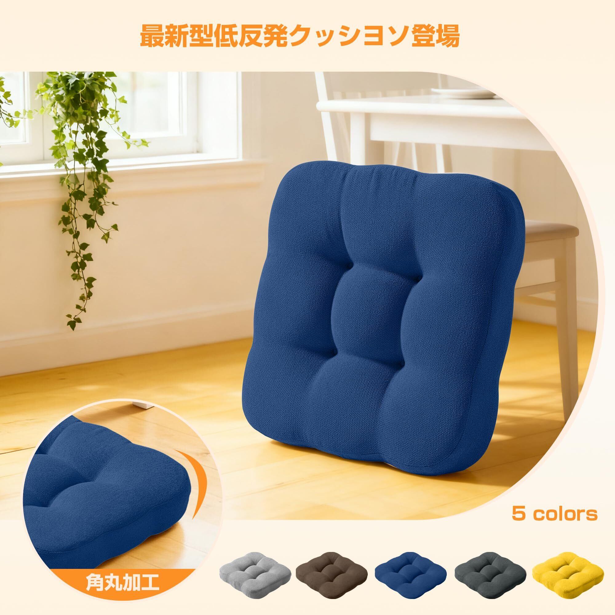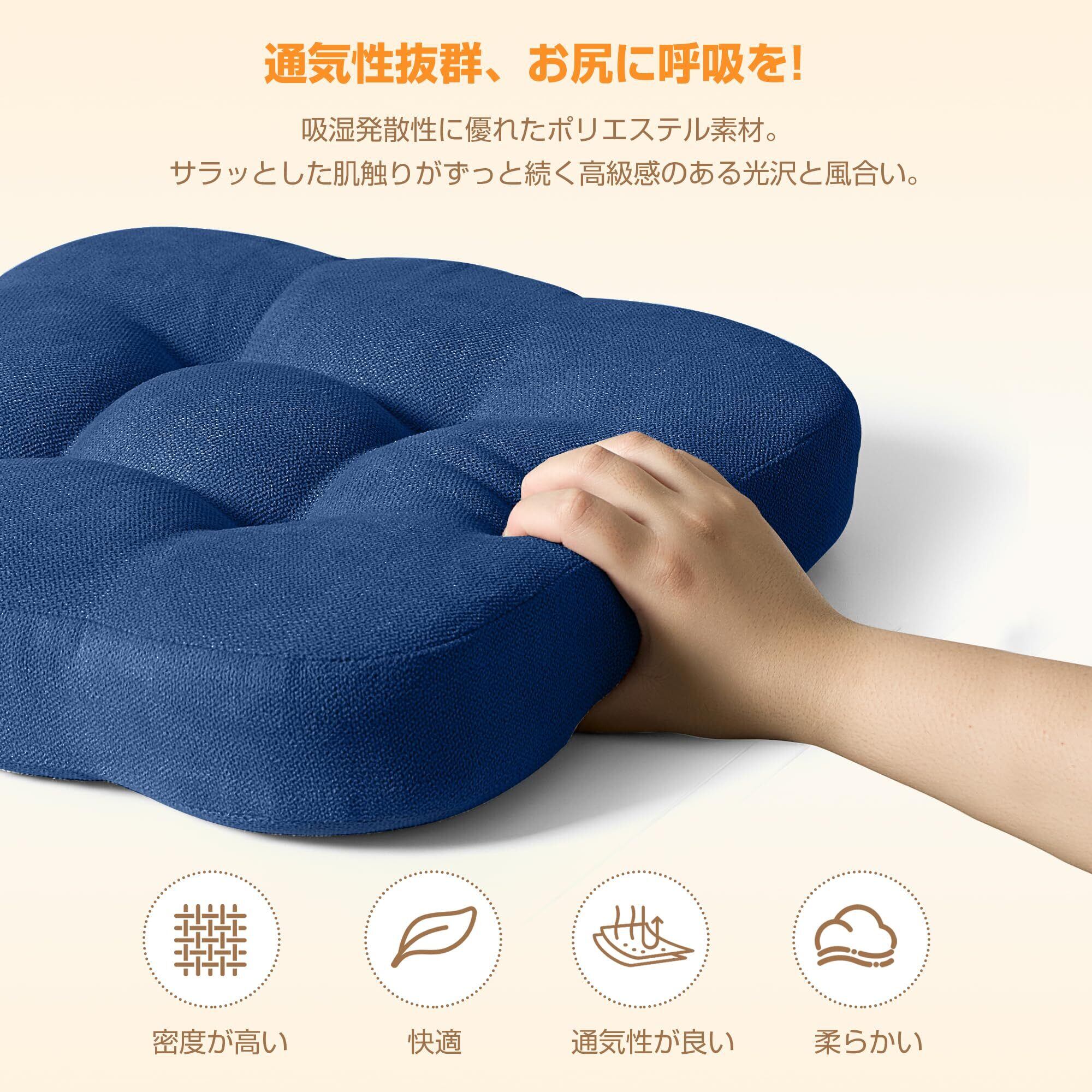 【やわらか低反発&2層構造中材】内側は2重構造の高密度ポリウレタン低反発素材を採用し、しっかりと体を支えて、お尻と腰を優しく包み込み、圧力を分散し、座り心地抜群です。木製の椅子やフローリングの床に長時間座っていても、ふかふかの座り心地でお尻が痛くなりません。座布団カバーは麻のような自然な風合いで通気性抜群。蒸れにくく、一年中快適にお使いいただけます。
