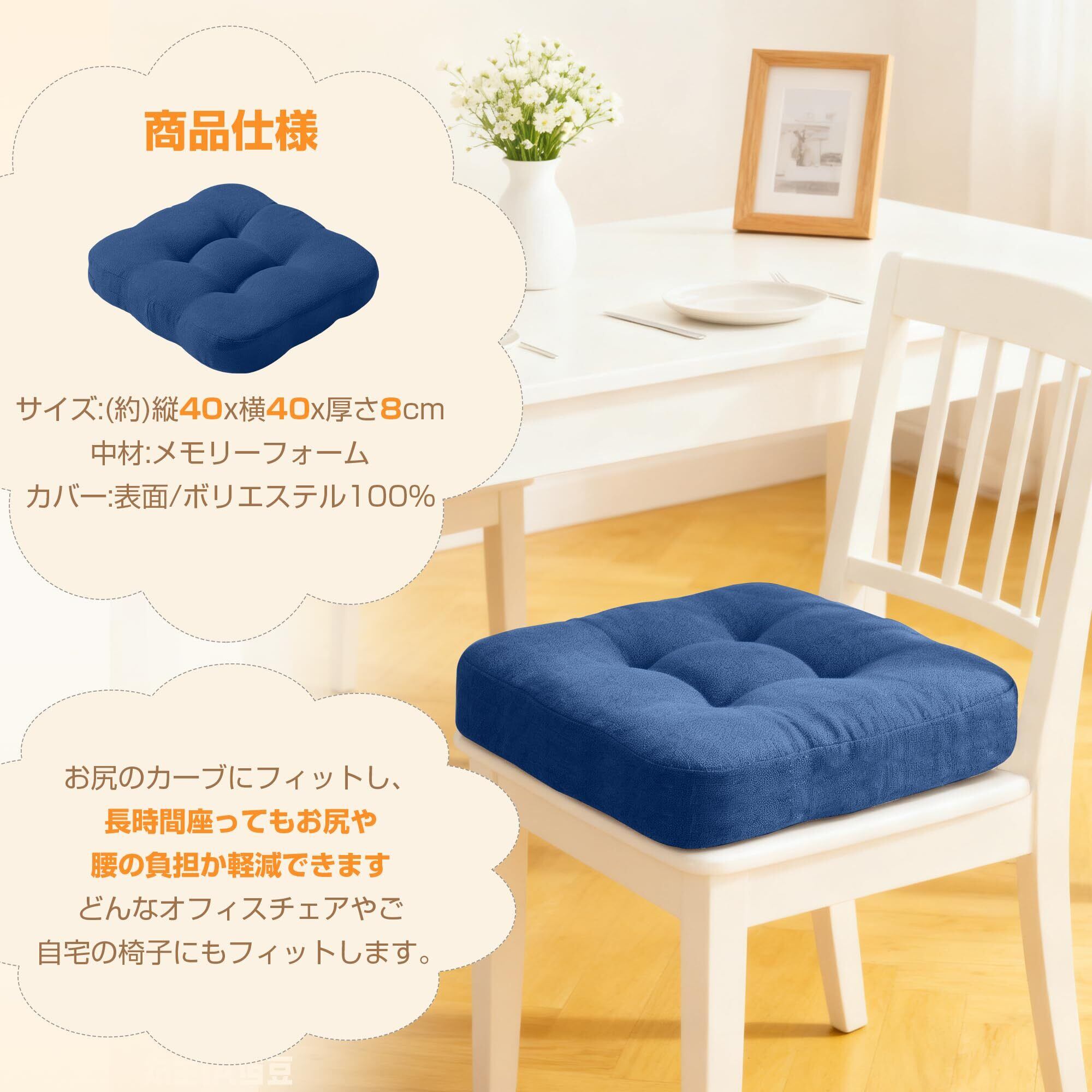 【商品仕様】サイズ:幅40cm×奥行40cm×厚さ8cm、素材:表地(ポリエステル100%)、中材(ポリウレタン100%)、重量:約0.6kg/個。対応チェア:ダイニングチェア、オフィスチェア、フロアクッション、ソファクッションなど。こんな方にオススメ:長時間のデスクワークや運転でお尻や腰が痛くなりやすい方、硬い椅子や冷たいフローリングの座り心地を改善したい方、インテリアに合わせたおしゃれで機能的なクッションを探している方
