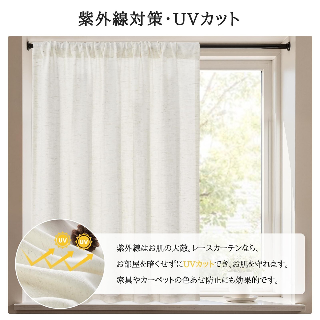 【UVカット】強い日差しを効果的に遮断し、適度な明るさを確保します。紫外線吸収によるUVカット機能で家具やカーペットの色あせを防ぎます。
