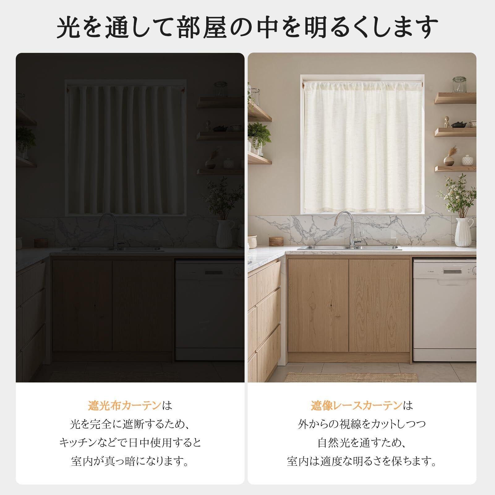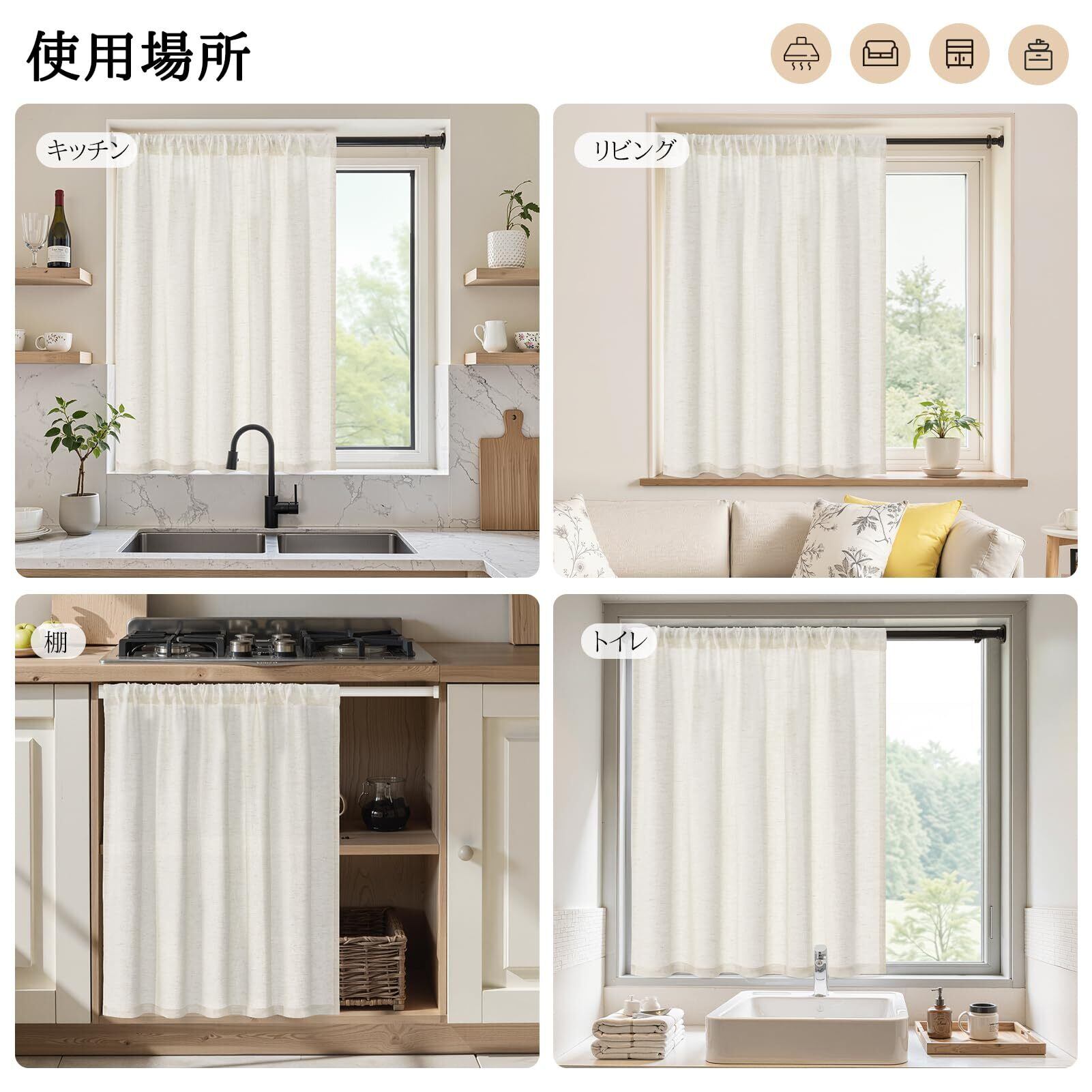 【主な用途】キッチン、リビング、トイレの小窓や棚の目隠しなど用途はさまざま。表裏同色なので、間仕切りカーテンとしてもおすすめです。