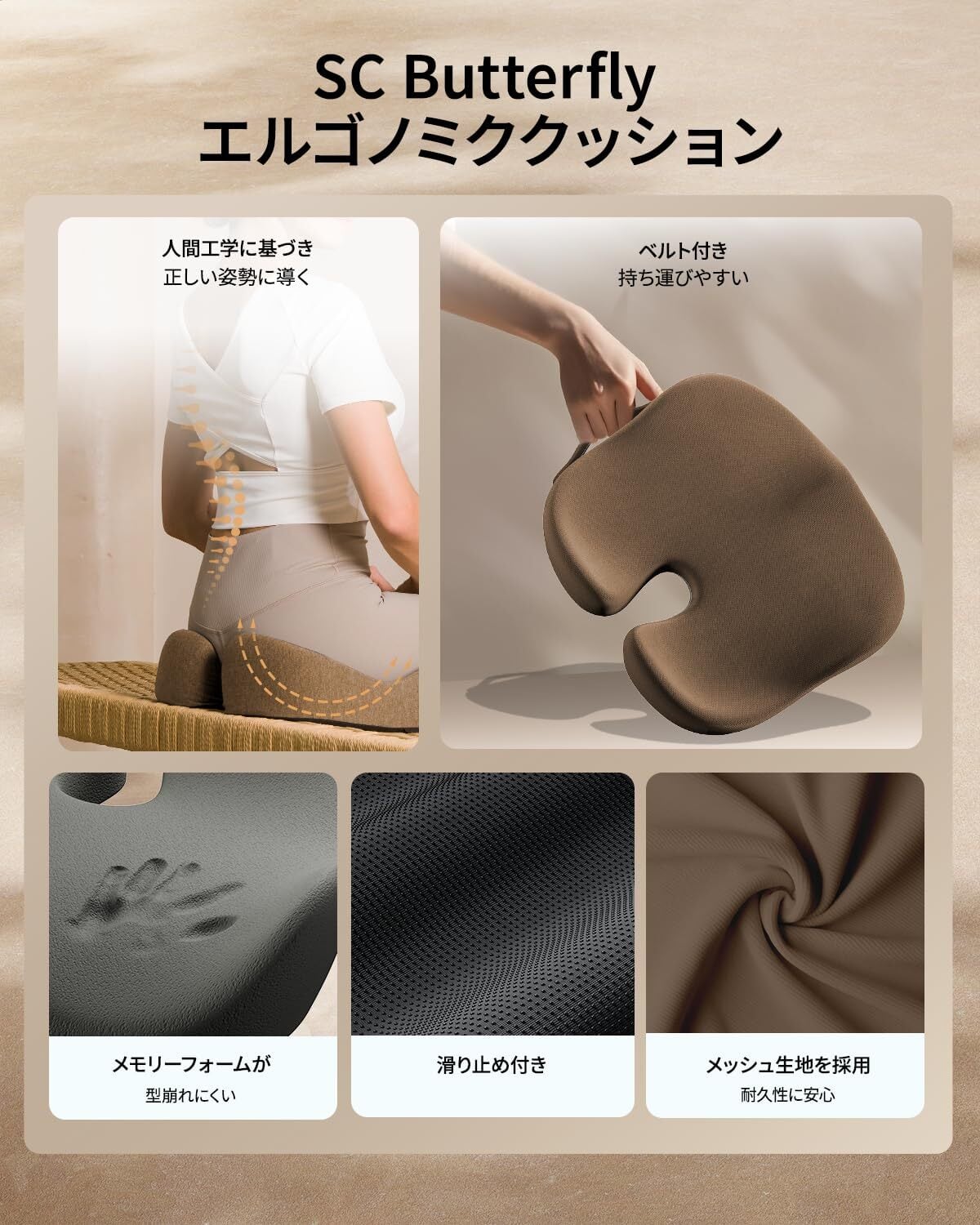 【洗えるカバー&滑り止め加工】 クッションカバーは取り外して洗濯可能で、いつでも清潔にお使いいただけます。 業界トップクラスの材質である食毛布を採用し、起毛しにくく耐久性にも優れた、安心して使えるお尻がいたくないクッションです。 裏面には滑り止め加工を施しており、ズレにくく安定感のある設計。 さらに、持ち運びに便利な取っ手付きで、オフィスや外出先などさまざまなシーンで活躍します。 ※中材(メモリーフォーム)は洗濯できません。