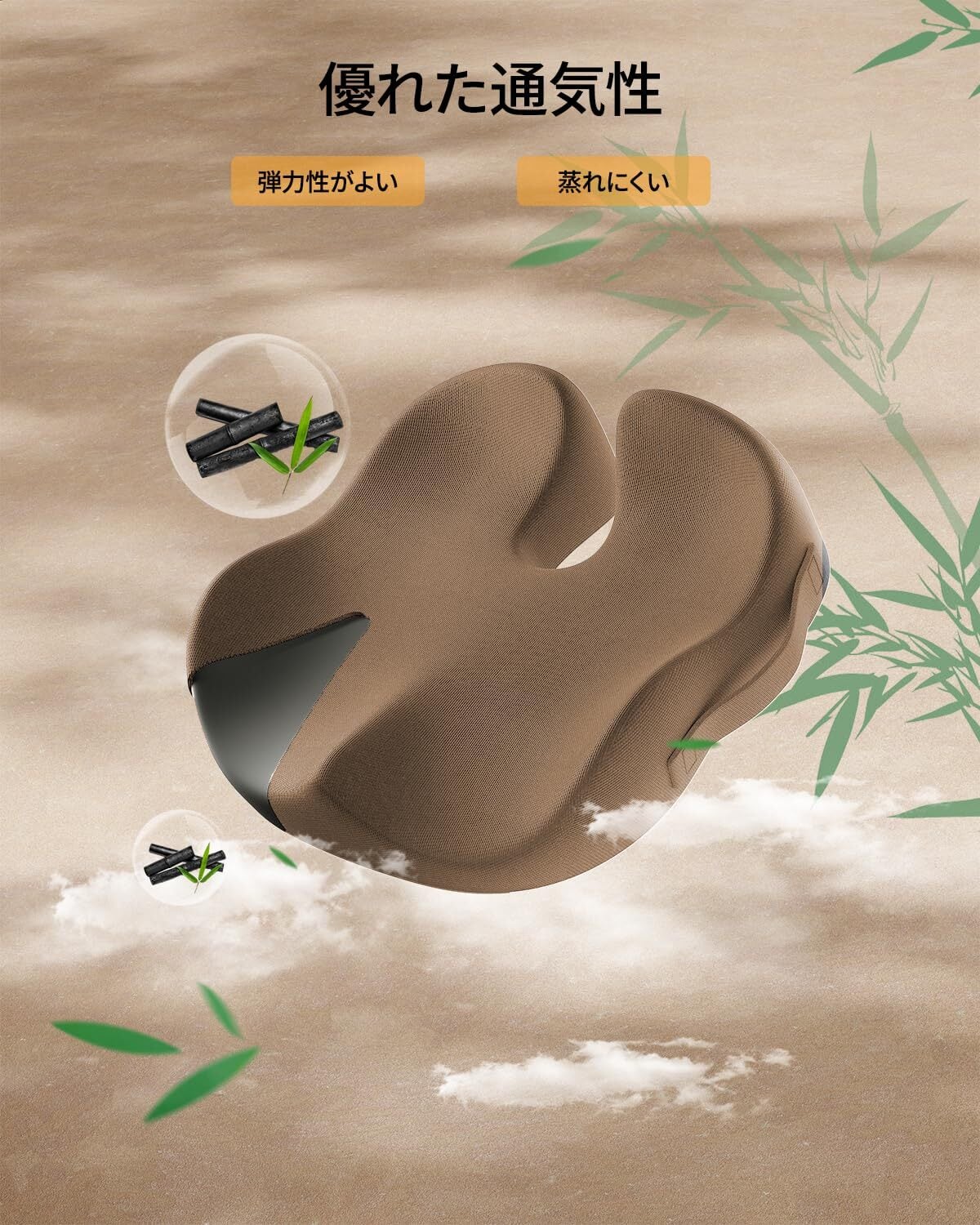 【優れた通気性】 竹炭を配合したフォームを使用し、清潔さと通気性を両立したイスクッションです。体がやさしく沈み込むソフトな使用感を実現し、長時間のデスクワークから日常の着座シーンまで、ムレにくく快適にお使いいただけます。