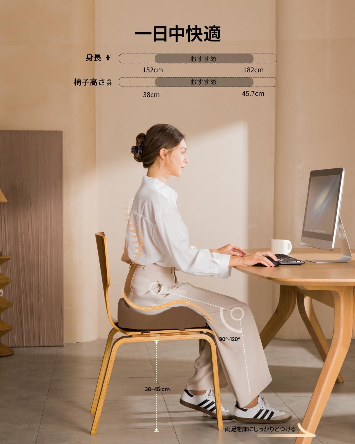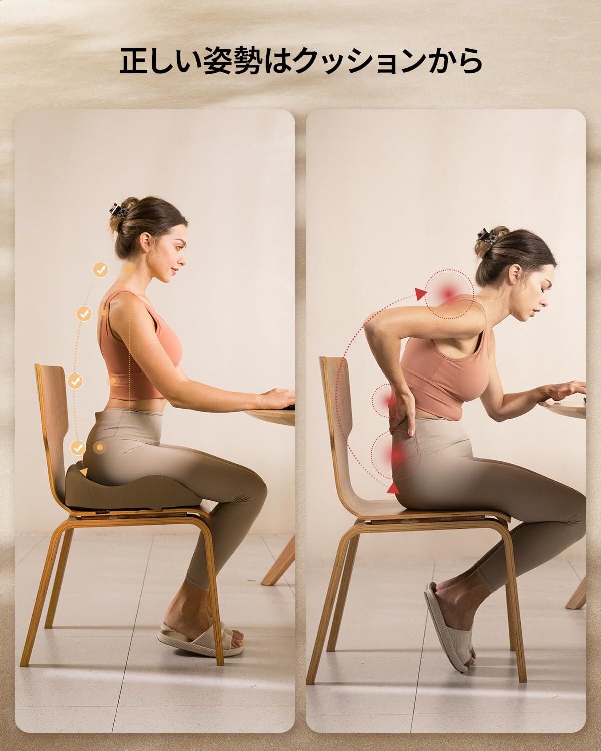 【自然に正しい姿勢へ導く設計】 緩やかな前傾設計により、座るだけで自然と重心が前方に移動します。 背筋がまっすぐ伸び、無理なく適当な姿勢になります。 長時間座ってもバランスがとりやすく、体への負担をけいげんするサイアティカクッションです。