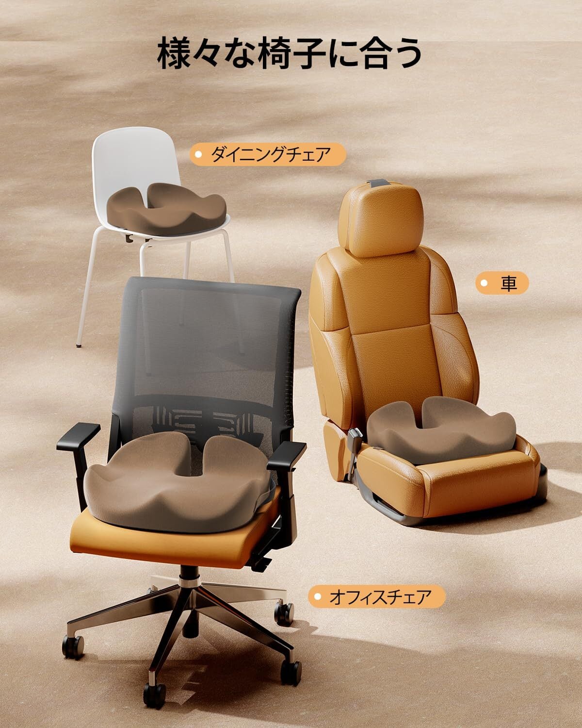 【幅広い使用シーンに対応】 オフィスチェアやゲーミングチェアをはじめ、車椅子、車の運転席、飛行機、電車など、さまざまな座席で使用可能。デスクワークやヨガ、たたみの上など、日常の幅広いシーンにも対応します。 毎日のデスクワークや長距離運転、高齢者の方の着座時にもおすすめです。 長時間座る方の快適な着座環境に配慮したクッションです。 ※本製品はいりょう用ではありません。あらかじめご了承ください。長時間座り続ける場合は、1時間に一度を目安に立ち上がって体を動かすことをおすすめします。