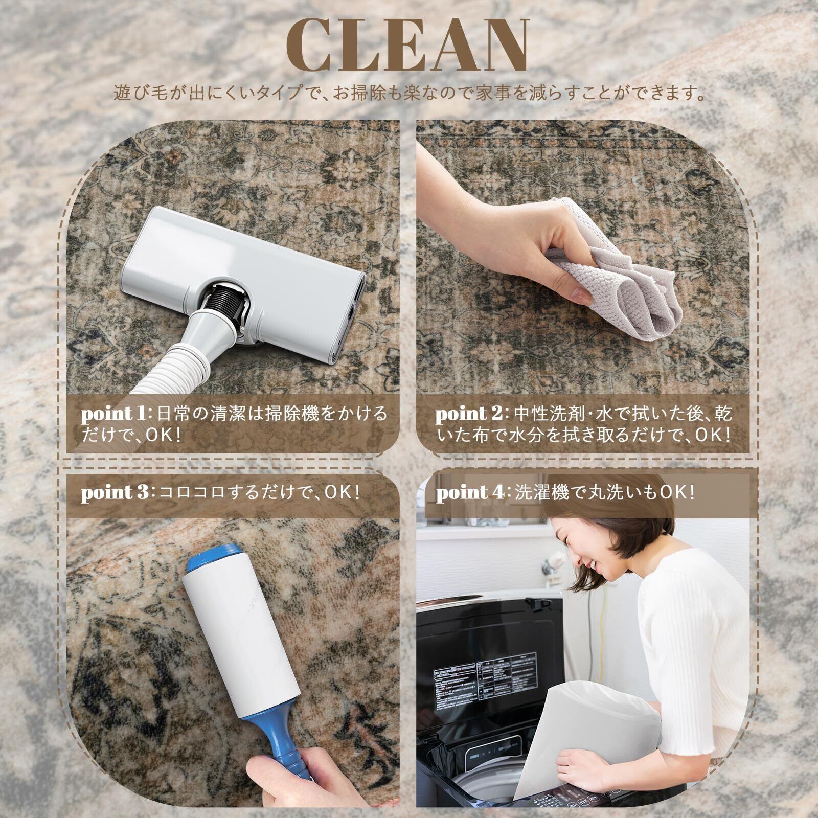 【お手入れ便利】毛足がないので、ゴミが絡みにくく、日常の清潔は粘着クリーナーをコロコロするや掃除機をか けるだけでキレイになります。また、汚れた場合は手洗いや洗濯ネットに入れて洗濯機で洗うことができます(ご 注意:風通しの良いところで陰干しし、アイロン、乾燥機の使用をお避け下さい。)