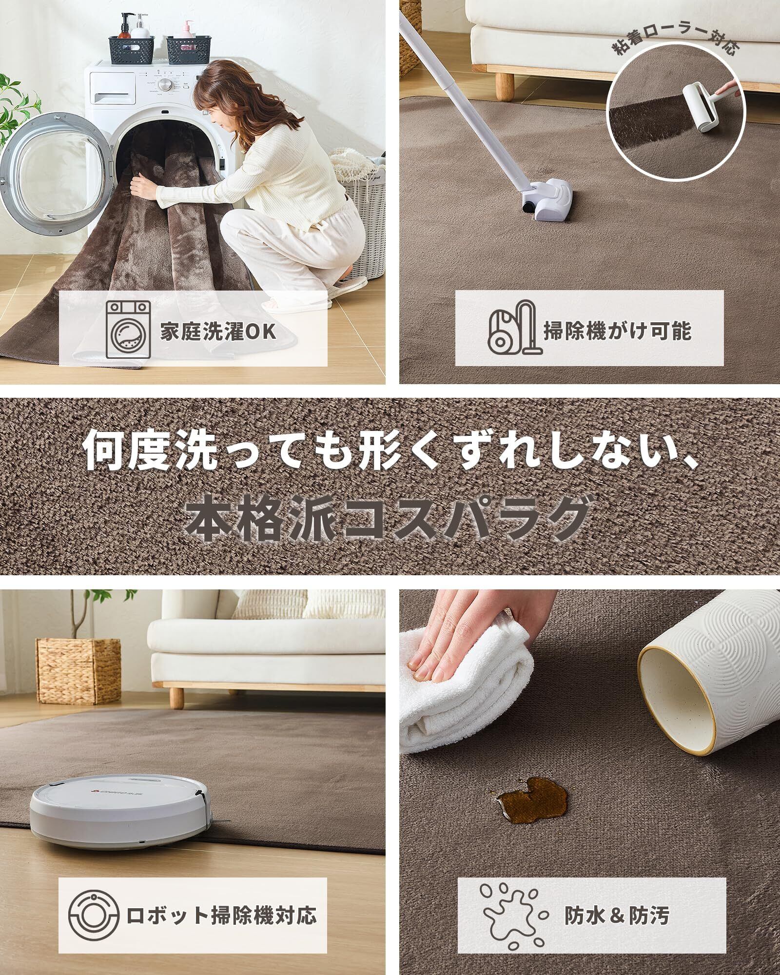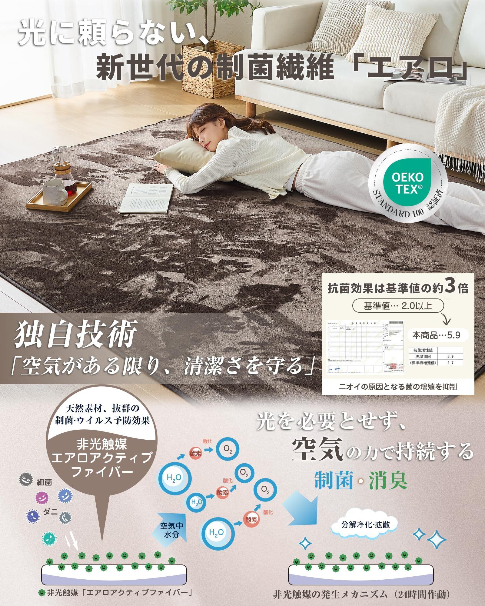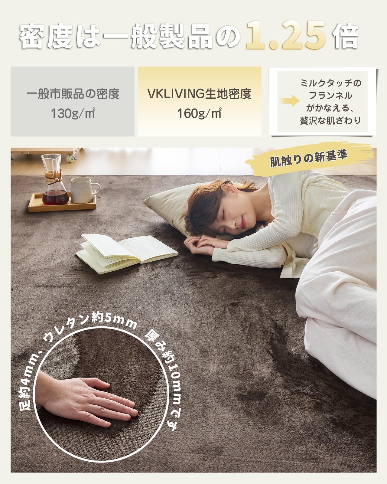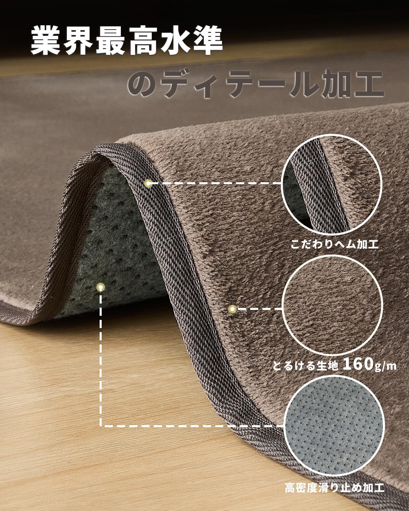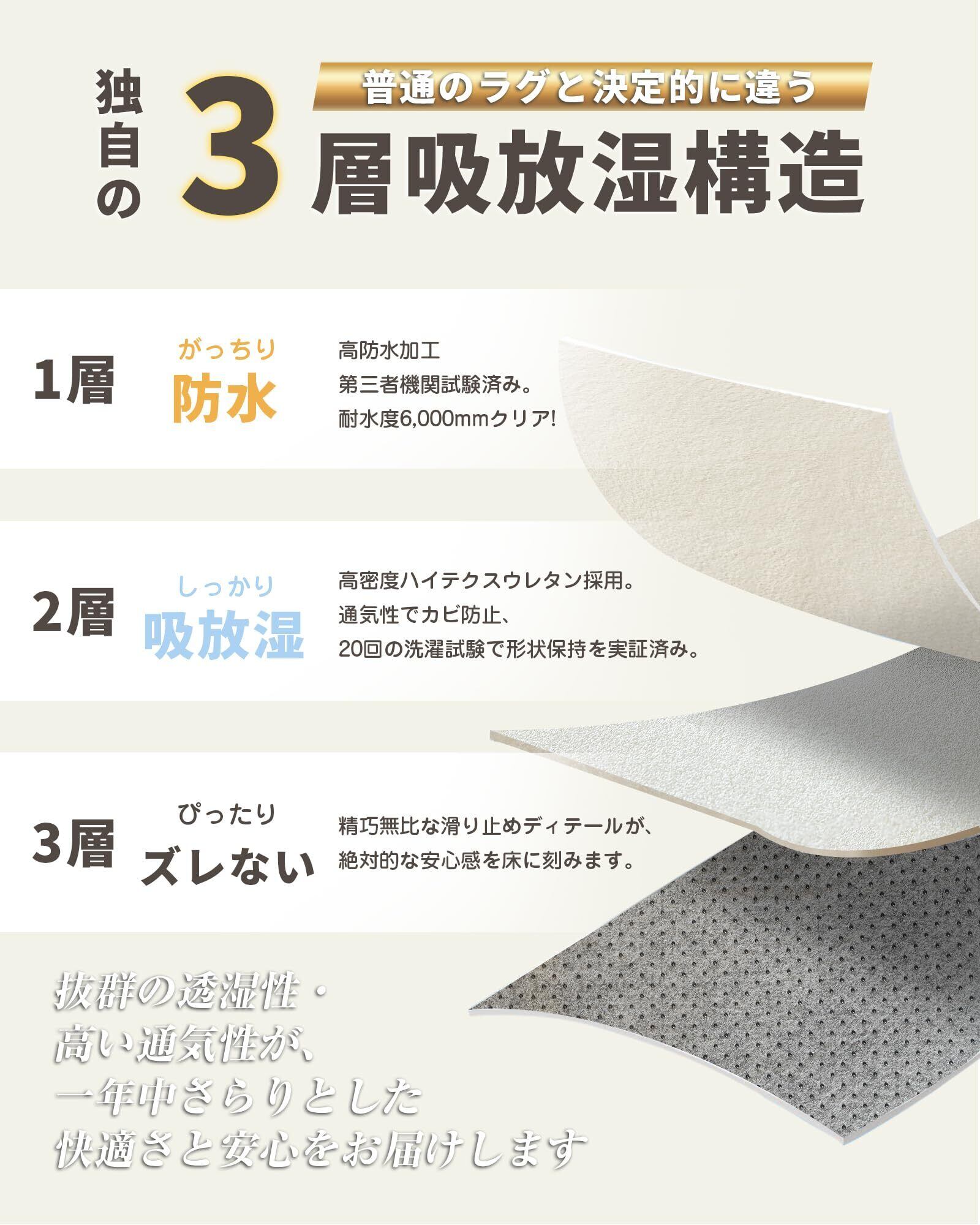【独自の3層構造が、1年を通じて“ちょうどいい”快適さを実現】一般的なラグとは異なる3層設計が、四季を問わないさらりとした心地よさの秘密です。①肌なじみの良い高密度フランネルが優しい肌触りを提供 ②“呼吸する”特殊ウレタンが湿気を吸放湿し、ムレやカビを防止 ③精密な滑り止めが、走り回るお子様も安定感を確保。湿気が多い日も、乾燥する季節も、床が冷たい朝も、いつでも快適な空間をお届けします。
