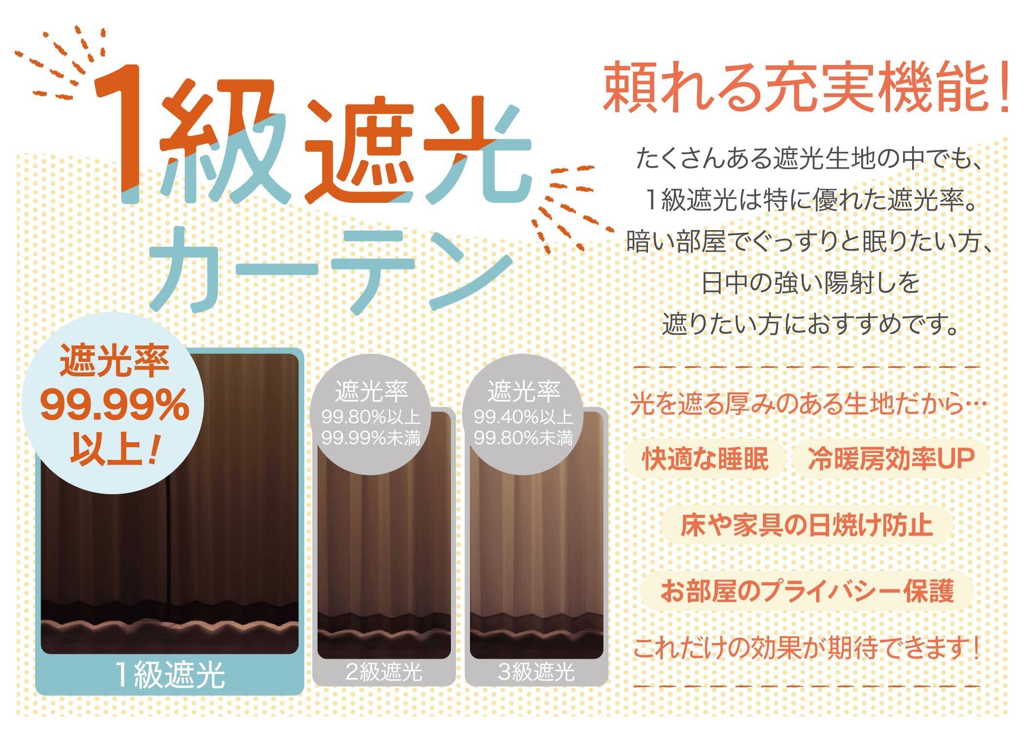 【1級遮光】遮光率99.99%以上の遮光カーテン。光をほとんど通しません。夜間、外の街灯が気になるお部屋、夜間勤務のある方で昼にぐっすり眠りたい方、没入感を高めて動画鑑賞を楽しみたい方におすすめです。