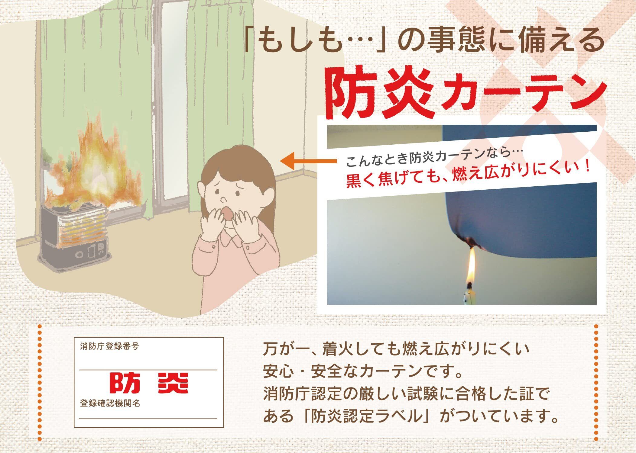 【防炎】万が一着火しても燃え広がりにくい性質を持つ安心・安全のカーテンです。消防法により防炎カーテンの使用が定められている、高層マンションや店舗・福祉・教育施設等はもちろん、防災の観点から一般住宅にもおすすめです。