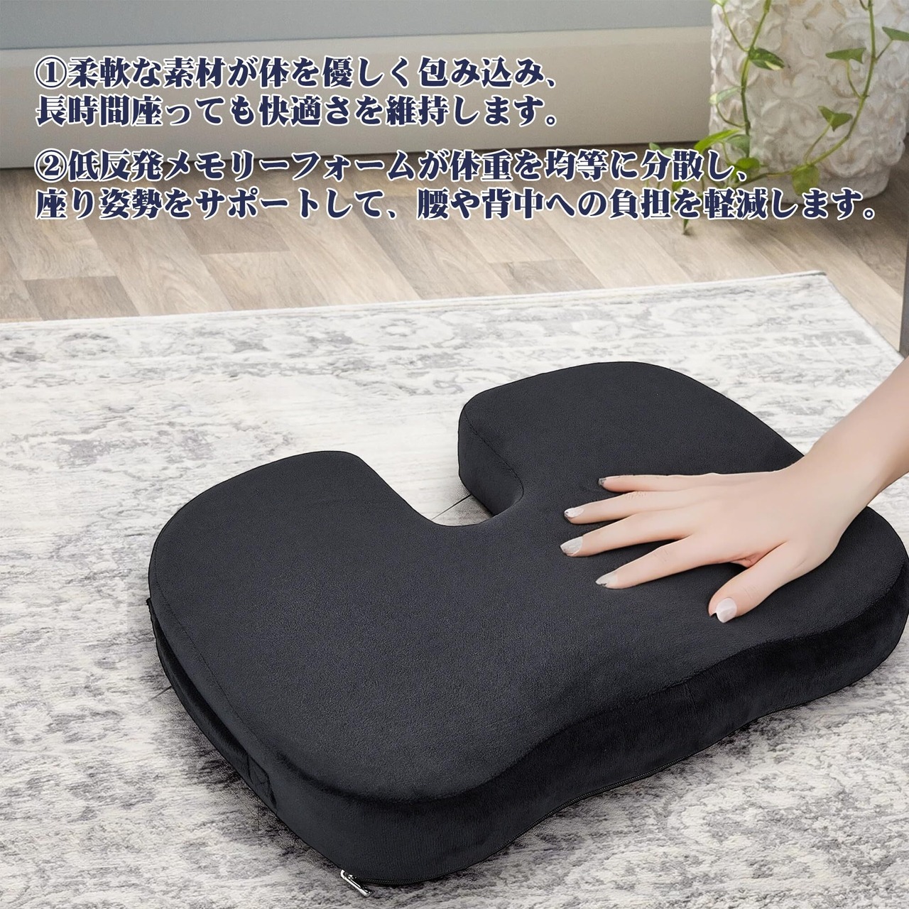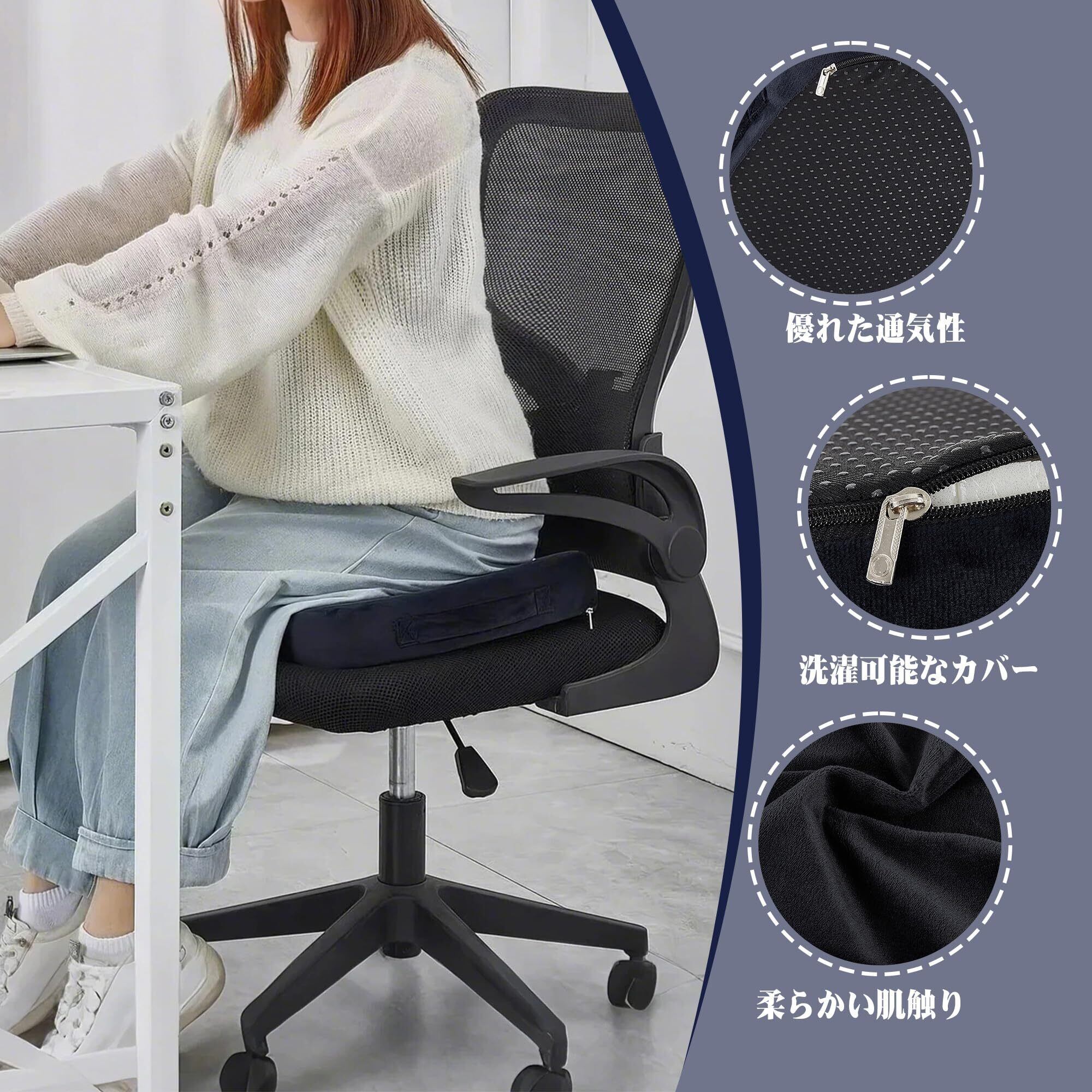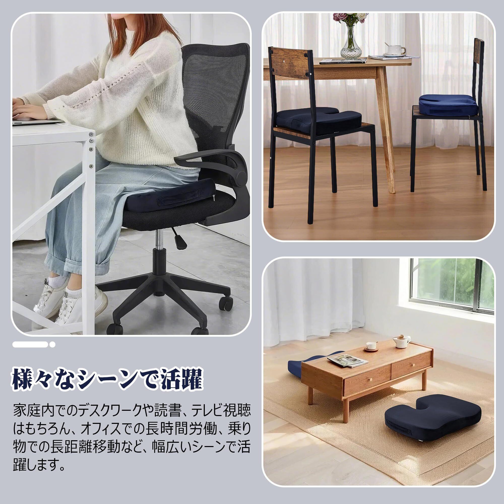 本製品は、長時間の座り作業の快適性を追求した低反発メモリーフォーム採用の円座クッションです。腰や尾骨への負担を軽減し、正しい姿勢をサポートします。オフィスや自宅、車内、旅行など、さまざまなシーンで使用できます。機能性とデザイン性を兼ね備えたこのクッションで、快適な座り心地をお楽しみください。