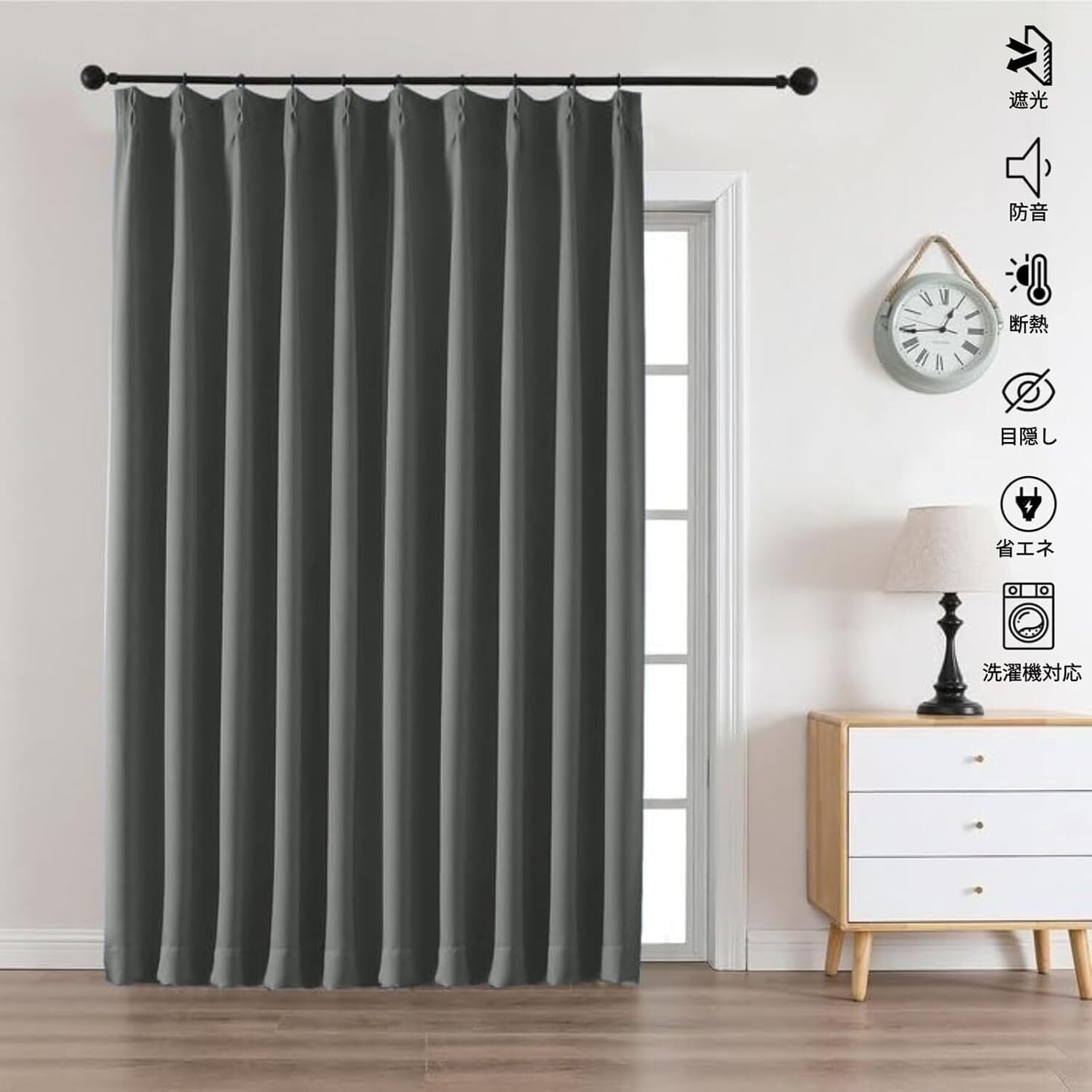 【商品仕様】セット内容:遮光カーテン*1枚、カーテン用アジャスターフック*12個 ※遮光性、断熱性、防音性に優れています。