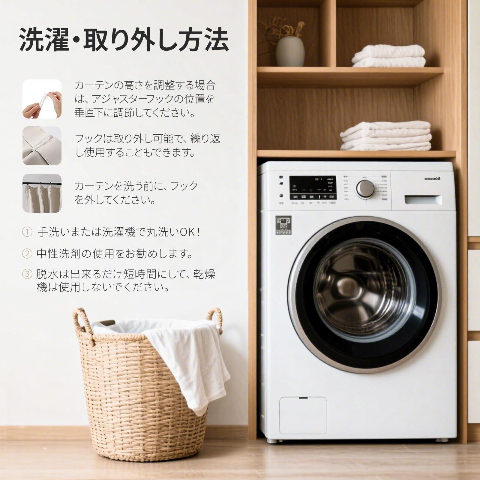 【お手入れ便利】洗濯機で丸洗い可能なので、お手入れは簡単です。洗濯時にフックを外し、洗濯ネットに入れて洗濯ください、洗濯後は自然乾燥をお勧めします。中性洗剤の使用をお勧めします。漂白剤や他の腐食性洗剤のご利用をご遠慮ください。フックの取り付けは便利で、1-3cmの高さを调节することができます。