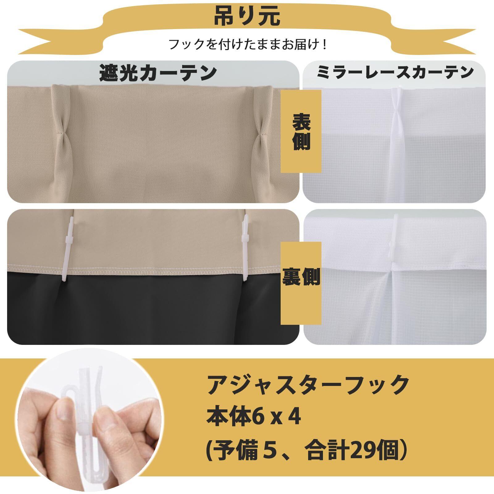 【セット内容】カーテン × 2枚,ミラーレース × 2枚, 同色タッセル × 2本,フック × 29個(カーテンに装着済みの24個と予備5個)。 ※1.5倍幅:幅は1.5倍ヒダ仕様(仕上がり幅の1.5倍の生地を使用)で、自然で美しいウェーブを演出します。 ※丈调节:フックには約1~3cmの調整幅があり、カーテン丈の微調整が可能です。 ※シワについて:自然に掛けていただくことで、生地の重さにより洗濯後のシワは徐々に軽減されます。アイロンなどをご使用いただくと、より早く整えられます。