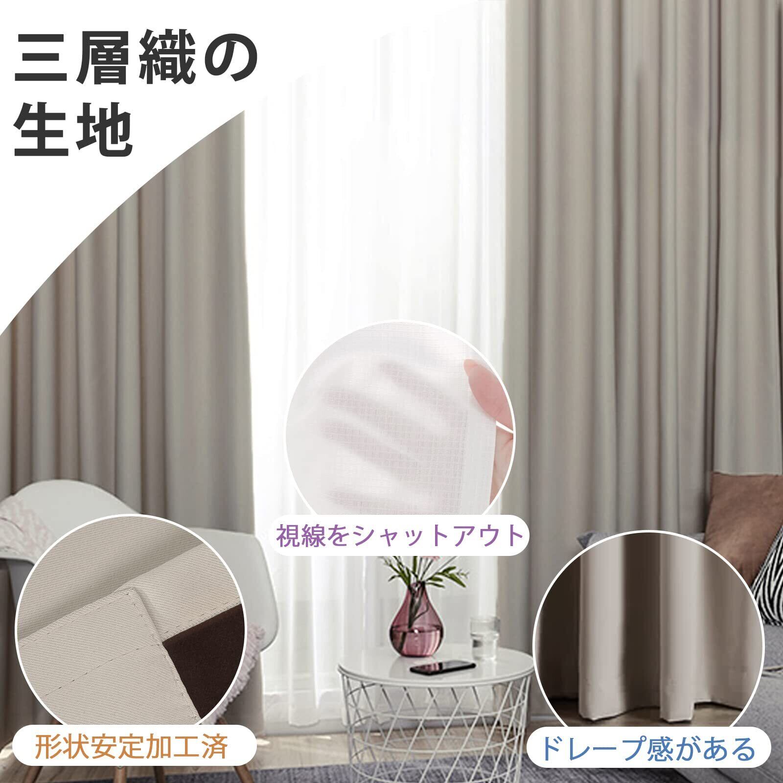 【三層構造・形状安定加工】厚手の生地、耐久性に優れた生地を採用しています。 1. 表地:高密度織りの生地を使用し、熱が通りにくく、優れた保温性を発揮し、落ち着いた無地のマットな質感で、高級感のある仕上がりです。 2. 中間層:黒色の遮光・吸音素材を使用し、遮光率約99.99%相当および防音効果を実現します。 3. 裏地:日光に最初に触れる層として、UVカット繊維を配合した生地を使用して、紫外線の侵入を抑え、肌・ペット・家具へのダメージを軽減します。 ※形状安定加工:すでに高温処理でウェーブを定着させているから、繰り返し洗濯しても裾のラインが乱れにくく、美しいシルエットを長く保ちます。