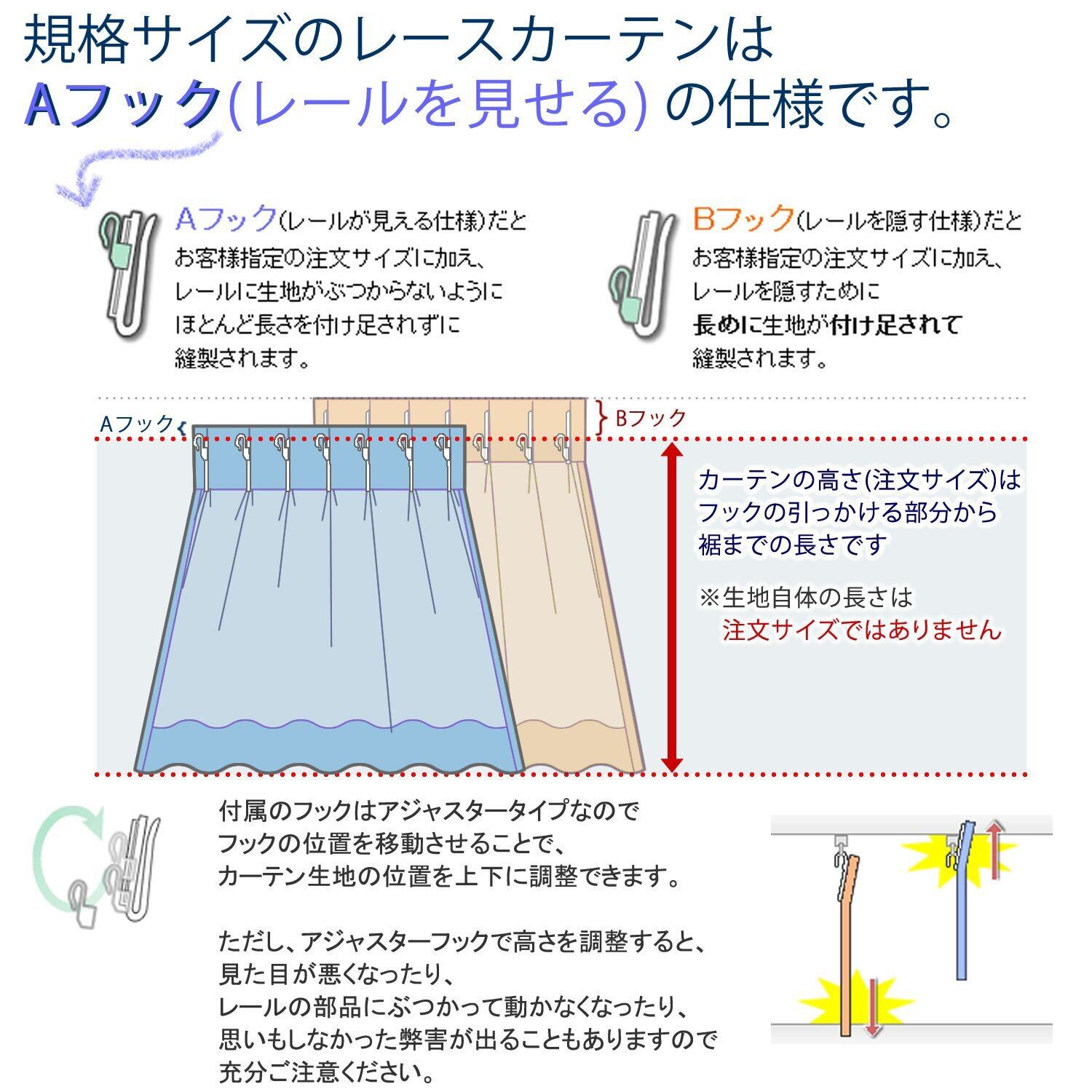 フック:アジャスターAフック(レールを見せる)つき⇒上部にレールを隠すための生地はほとんどついていません(約1cmのみ)。レールの下にぶら下がり、見せるように掛かります。組成 ポリエステル100% 洗濯 洗濯機で丸洗いOK ウォッシャブル (フックを外してネットに入れて洗いましょう) 日本製 ◆お使いのモニターや環境によって色の見え方が異なりますのであらかじめご了承下さい。◆撮影用にアイロン仕上げをしておりますが、実際の商品にはアイロン仕上げはございません。たたみじわはアイロンで取ることができます。