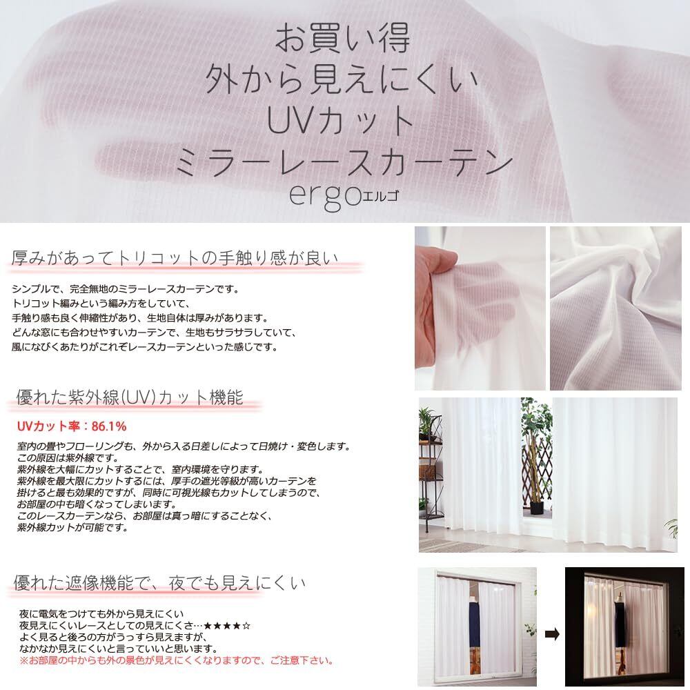 高品質なのにコストパフォーマンスに優れたレースカーテン! 完全無地のミラーレースカーテンです。 トリコット編みという編み方をしていて、手触りが比較的なめらかです。生地自体は厚みがあります。 UVカット率も86.1%と、UVカット効果も見込まれるレースカーテンです。 夜見えにくいレースとしての見えにくさ…よく見ると後ろの方がうっすら見えますが、なかなか見えにくいと言っていいと思います。このクオリティーの商品であれば、本来もっと価格が高くなってしまうはずですが、 なんとかギリギリまで価格を抑えることができました。 色はホワイト。真っ白に染めています。夜電気をつけてもかなり外から見えにくく、プライバシー保護におすすめ。※お部屋の中からも外が見えにくくなりますのでご注意下さい。商品画像は幅100×高さ176cm2枚組の写真です。カーテンレールは付属しません。◆お使いのモニターや環境によって色の見え方が異なりますのであらかじめご了承下さい。
