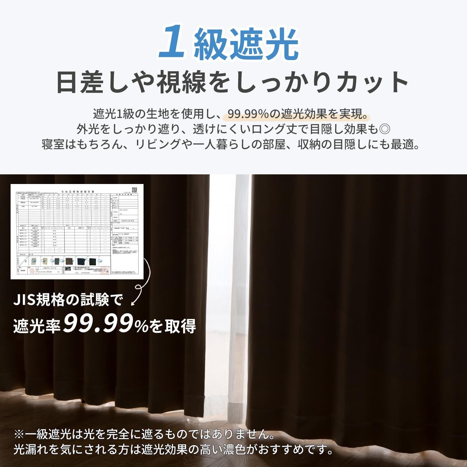 【1級遮光・目隠し】無地のカラーバリエーションに加え、遮光1級の高機能カーテン生地を使用し、99.99%の遮光効果を実現。外光をほとんど遮断し、透け感を抑えたロングタイプで、スッキリとした目隠し効果を発揮します。昼夜問わずぐっすり眠りたい寝室はもちろん、リビングや1人暮らしの部屋などプライバシー重視の空間にも最適。目線が気になる場所や収納を隠すのにも便利です。※一級遮光は光を完全に遮るものではありません。光漏れを気にされる方は遮光効果の高い濃色がおすすめです。