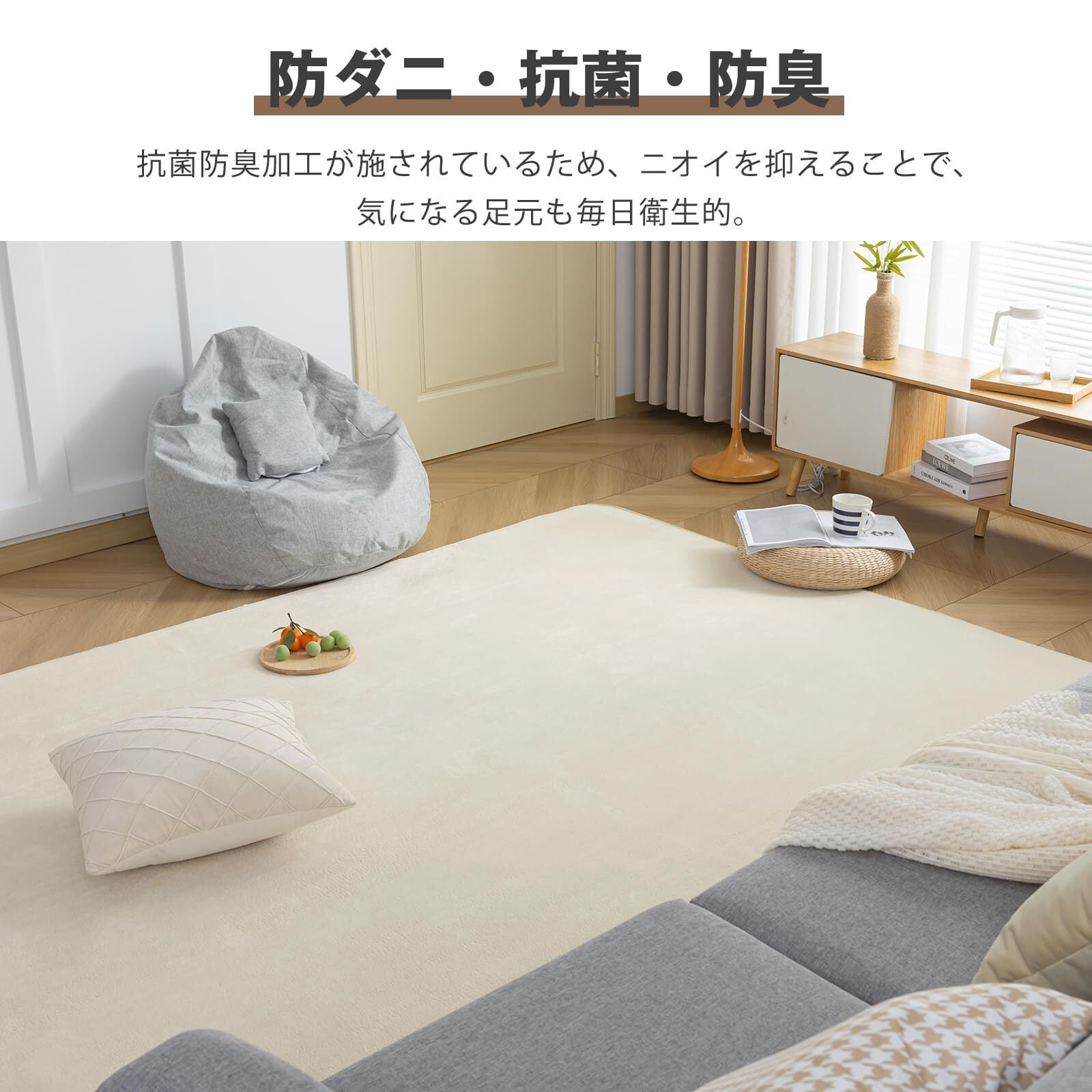 ✨【抗菌防臭・滑り止め付】防ダニ・抗菌・防臭、 ノンスリップ加工。裏面に滑り止めゴムがあるので、お掃除の時に滑る心配はまったくない!お子さまやお年寄りのいる家庭でも安全安心に使用できます。ラグの縁がポリエステル生地で丁寧に縫製し、丈夫で長時間使用できます。