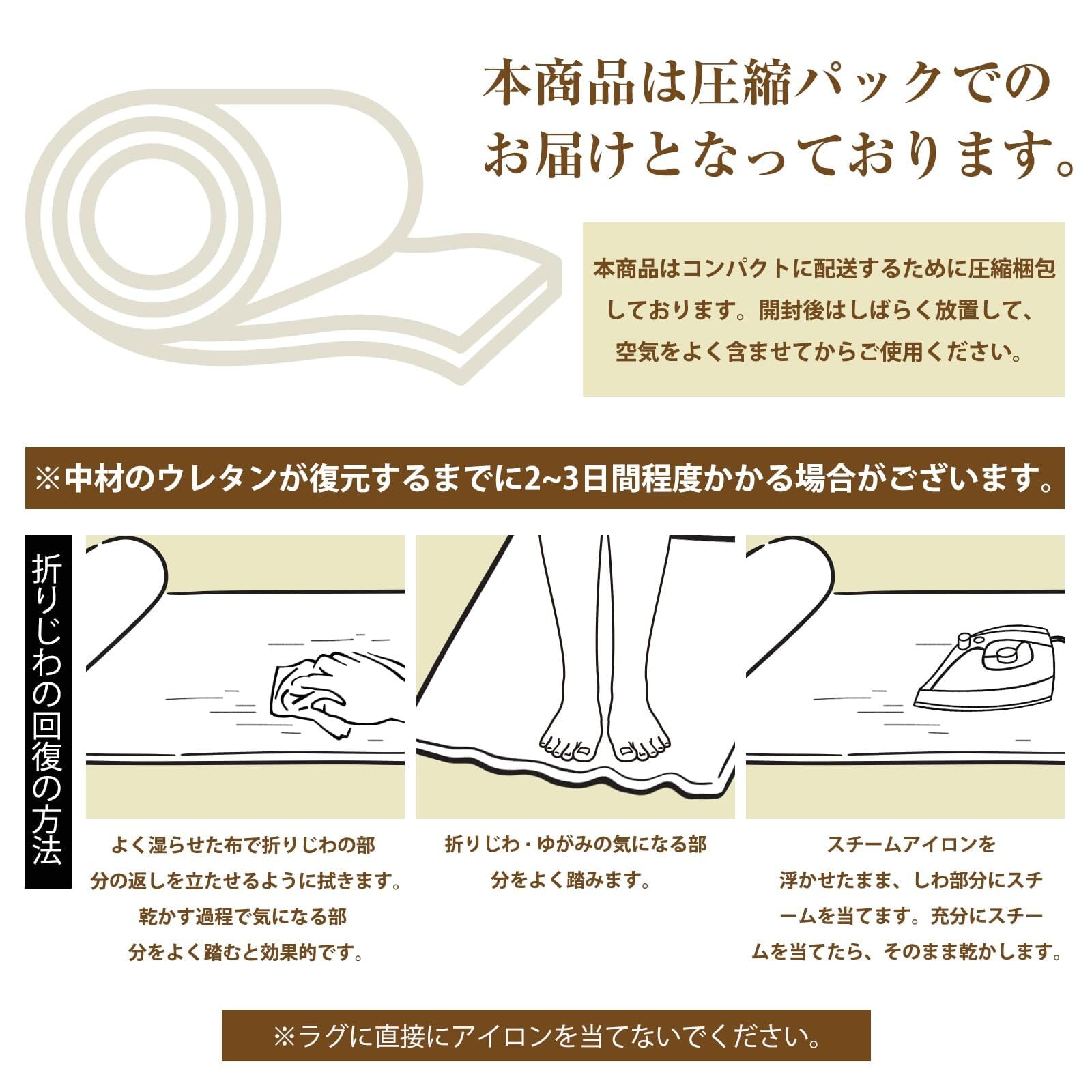 ✨【ラグ仕様】カラー:アイボリー 長方形ラグ 1.5畳 135x185cm 。起毛の高さ:約4mm、ウレタン厚:加工前約6.5mm、 絨毯表地:ポリエステル100% 中材:ウレタンフォーム 裏地:ポリエステル100%(不織布)【品質保証】商品輸送の際に折りたたんでお届けするため、開封時に折りジワ、歪み・寸法不足等の変形がありますが、ラグマットを広げて一週間ほどご使用になれば、ゆっくりと回復します。万が一商品に不具合がある場合、商品自体の問題がある場合は、弊社にご連絡いただければ迅速に対応いたします。弊社のラグにご満足いただけない場合、いかなる理由でもご返品いただけます。ご安心してお買い求め頂けます。