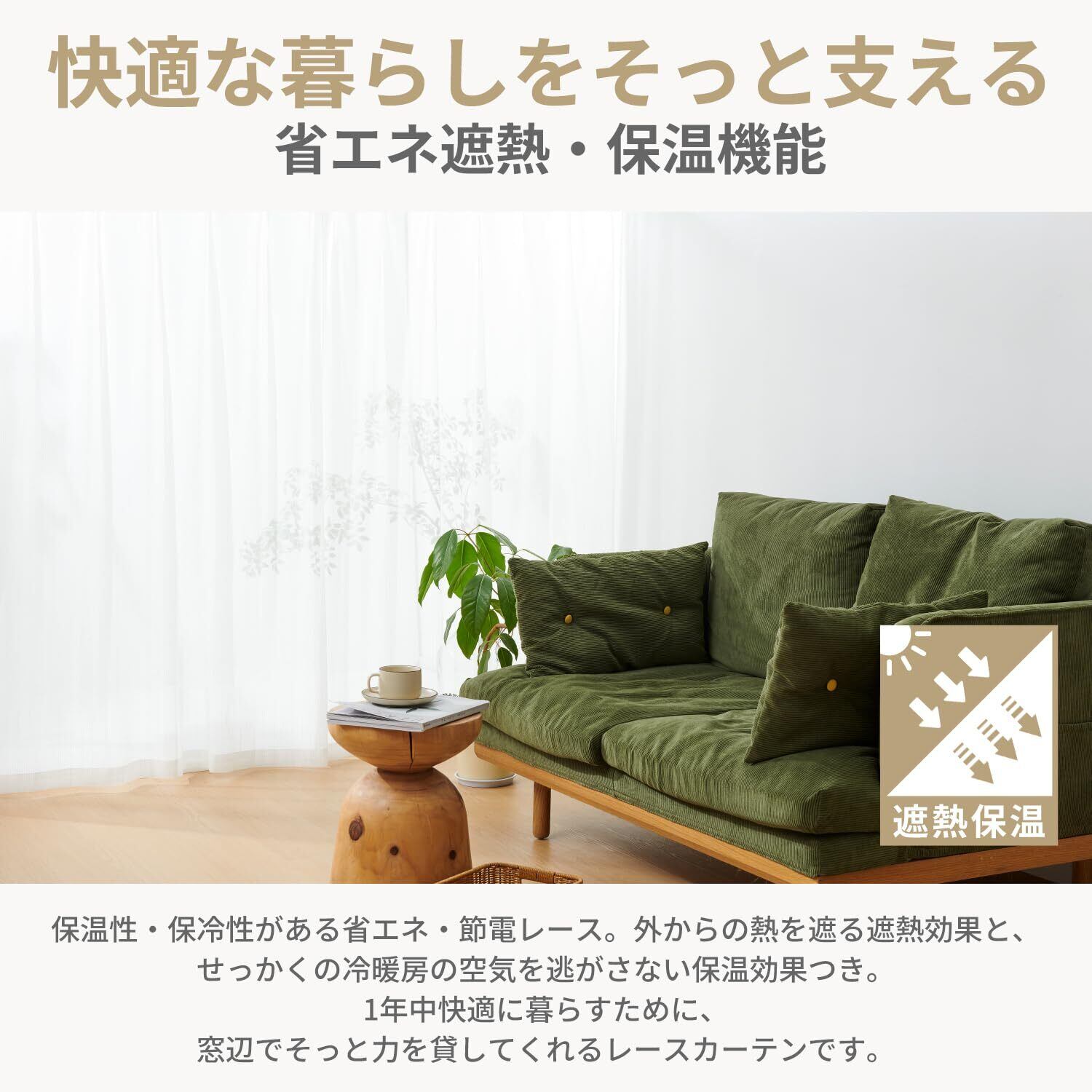 【遮熱・保温】保温性・保冷性がある省エネ・節電レース。外からの熱を遮る遮熱効果と、せっかくの冷暖房の空気を逃がさない保温効果つき。1年中快適に暮らすために、窓辺でそっと力を貸してくれるレースカーテンです。