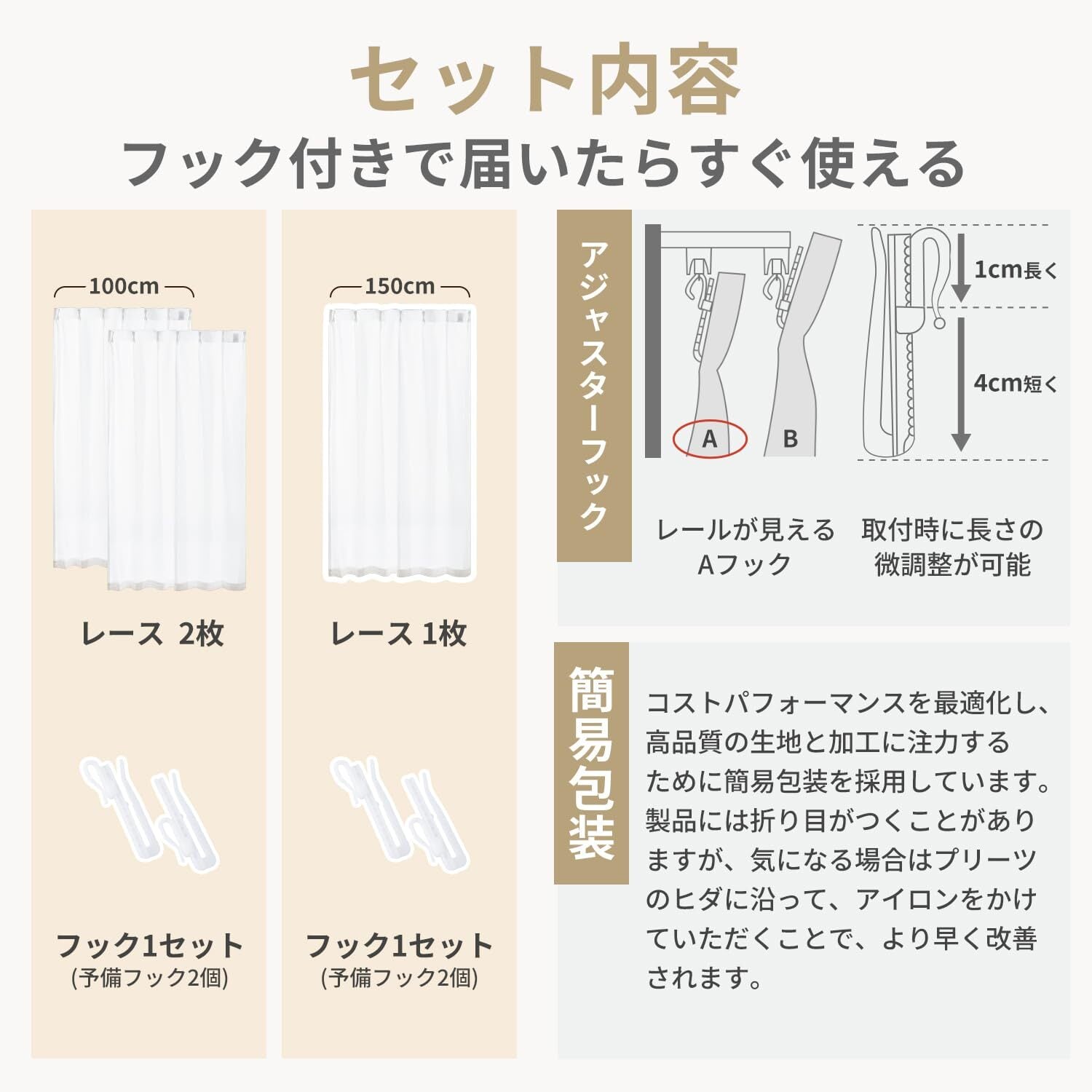 【商品仕様】※組成:ポリエステル100%。※機能:ミラー効果/UVカット/ウォッシャブル。※縫製:1.5倍ヒダ/ 2ッ山を採用し、出来上がり幅に対して使う生地の幅を1.5倍としっかり使うことで機能性がアップします。※セットで届く:ミラーレースカーテンにアジャスターフックがついているので届いてすぐお使いいただけます。※弊社ではコストパフォーマンスを最適化し、高品質の生地と加工に注力するために簡易包装を採用しています。