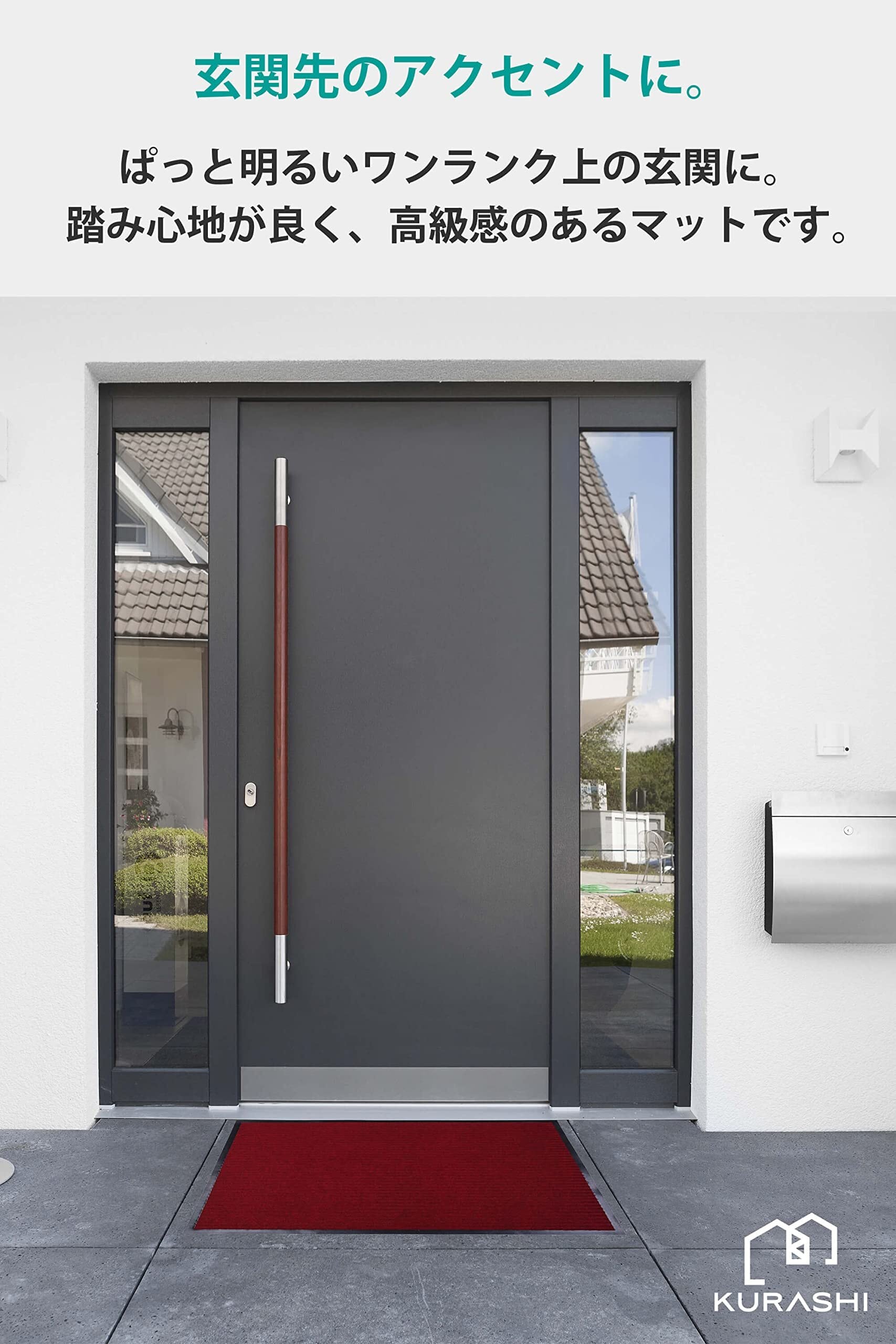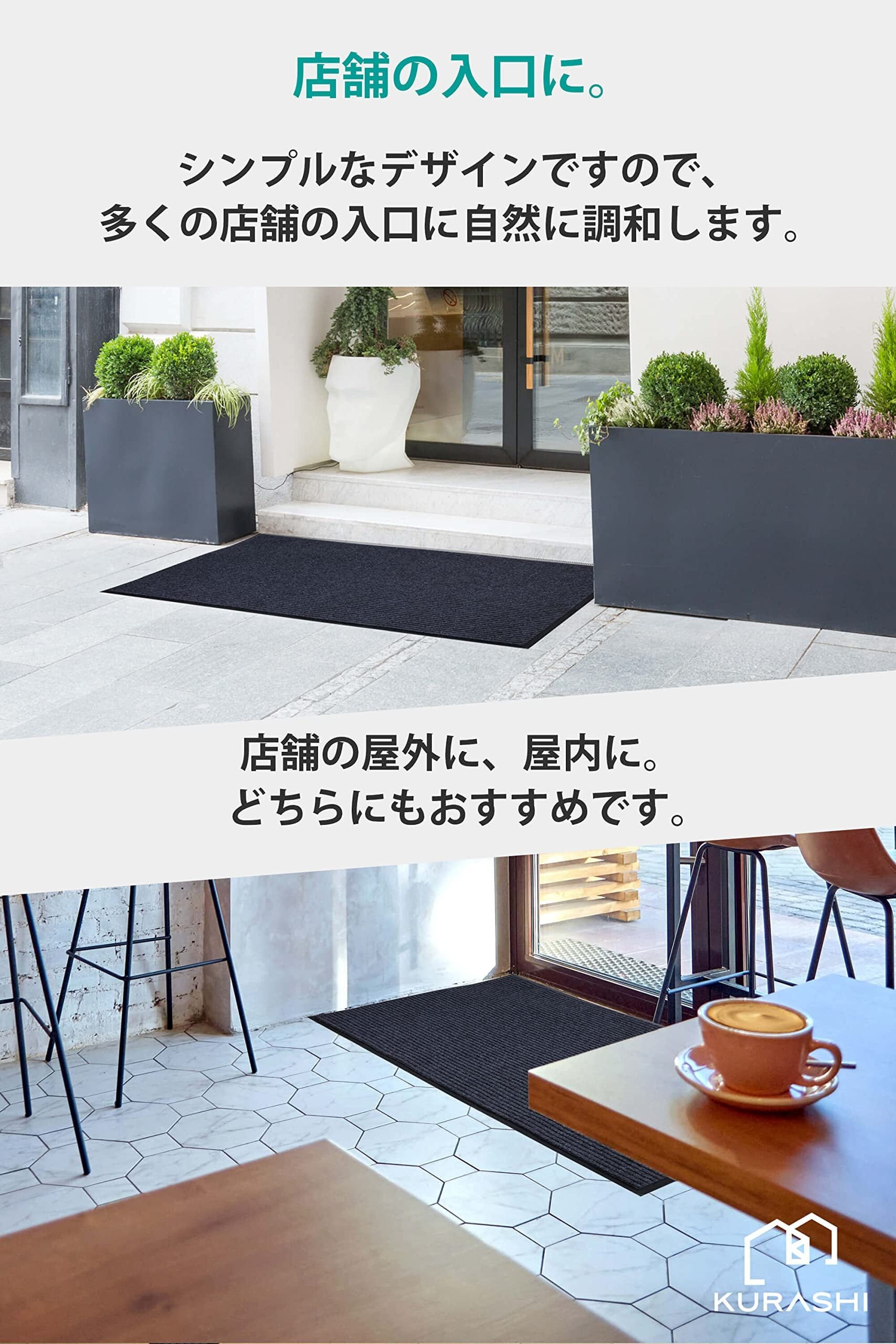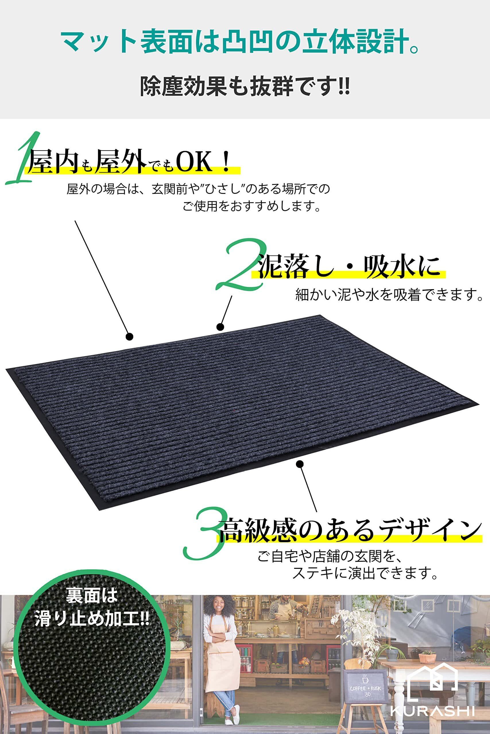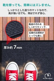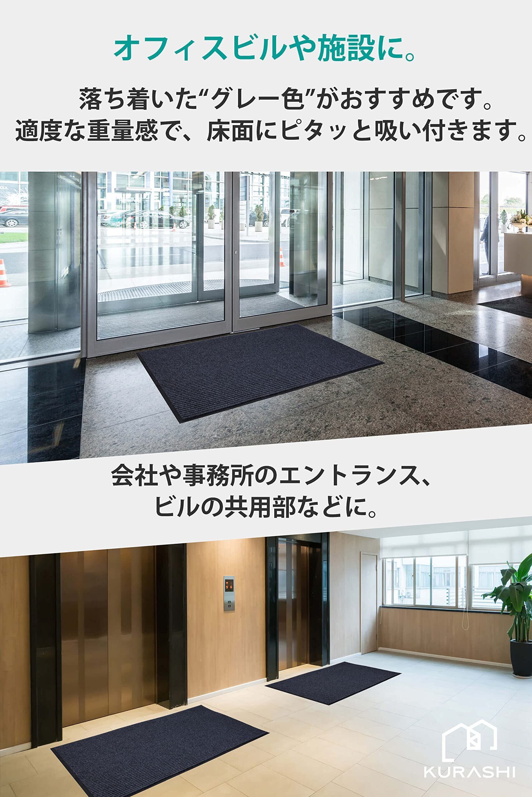 【使う場所を選ばない玄関マット。シンプルかつ高品質】屋内、屋外でお使いいただける玄関マットです。約7mm厚とドアに引っかからない絶妙な厚さで、ズレにくく、つまずきにくさを実現いたしました。床にピタっと吸い付くように吸着性良くフィットするため、届いてすぐに快適にお使いいただけます。一般的な類似品より少し重みがある設計をしていますので、風にも飛ばされにくい仕様です。主張しない外観なので、店舗から住宅、会社まで幅広い場所でご使用いただけます。タイル張りのポーチ、ビル階段の下や、エレベーター前、店舗の店先など、お客様が雨天で滑りやすい場所でも、高い吸水性能で効果を発揮します。一般の住宅の玄関外にマットを置くことで玄関の高級感がワンランクアップします。