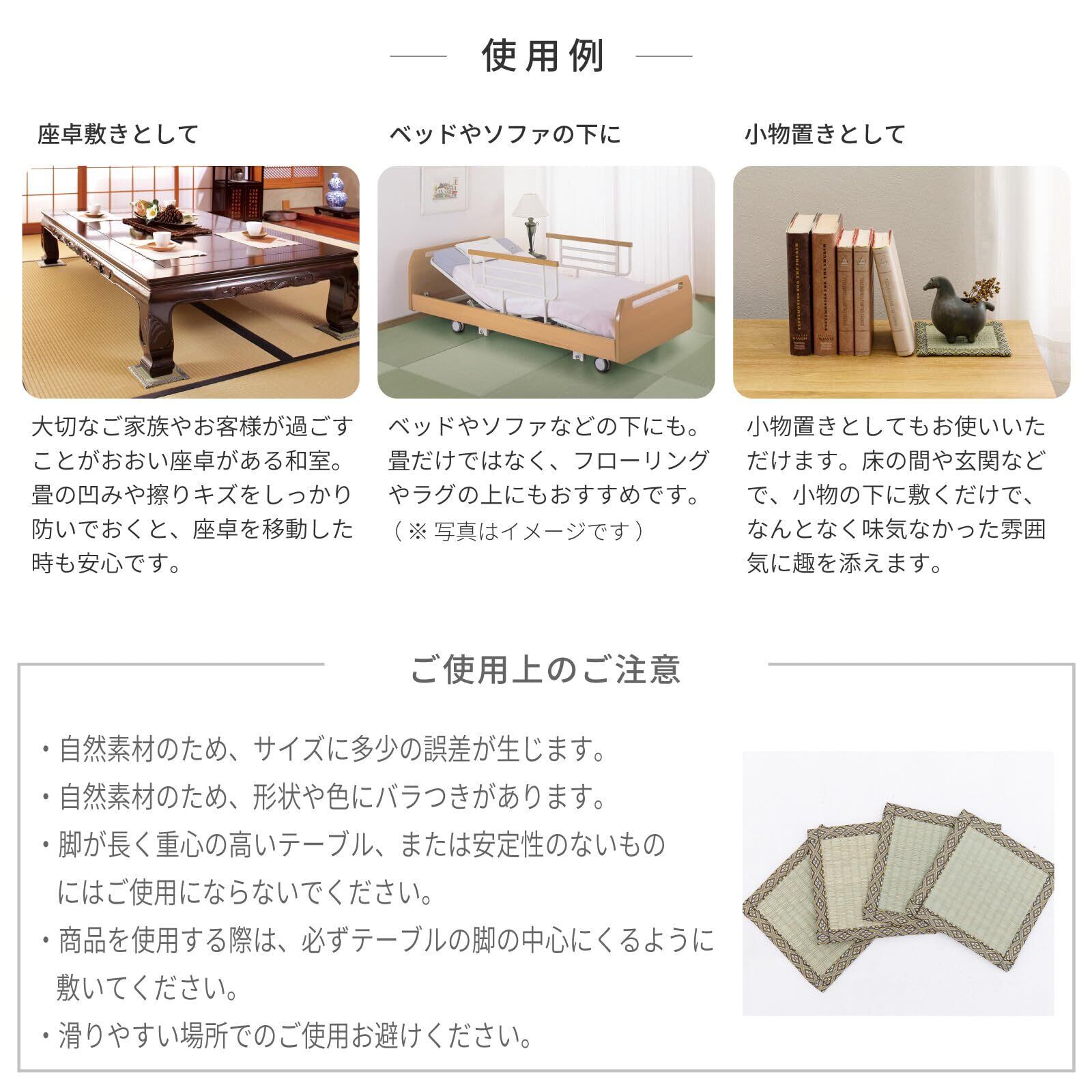 座卓・テーブル・ベッド・ソファなどの下に敷くだけで、畳のへこみや床のキズを防止します。座卓敷きとしてだけではなく、花瓶敷きや小物置きなどとしてもお使いいただけます。