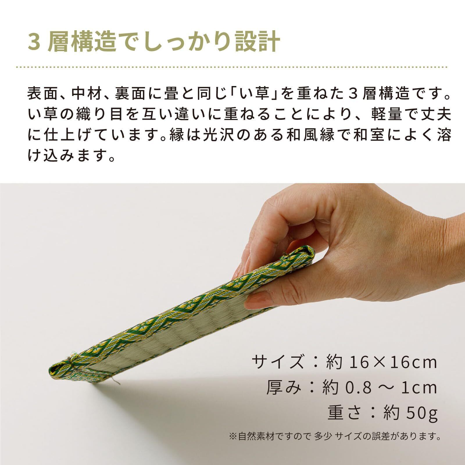 い草の織り目を互い違いに重ねた三層構造でしっかりしています。ゆとりの直径約16cmだから大きめの脚でも安心です。
