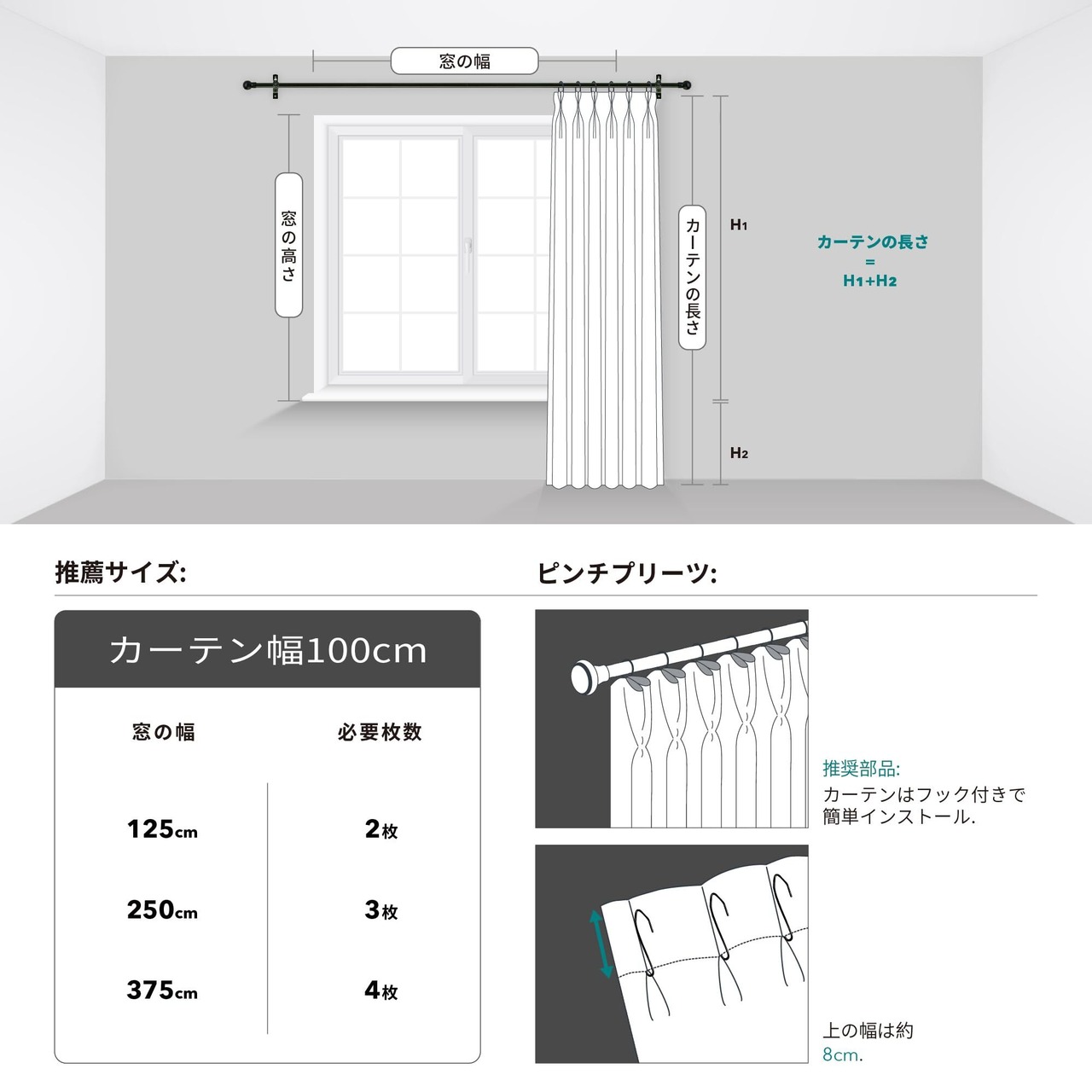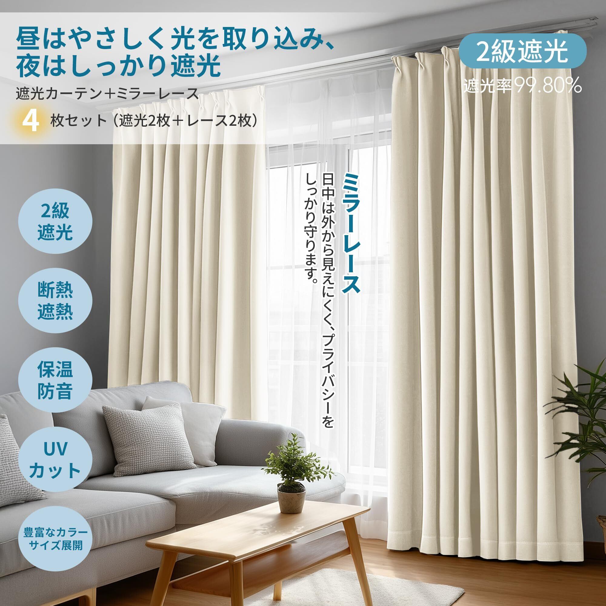 【4枚組カーテンセット】 厚地カーテン2枚+レースカーテン2枚の便利なセット。1つのパッケージで日中の採光と夜のプライバシー対策を両立し、寝室・リビング・子供部屋など幅広く活躍します。