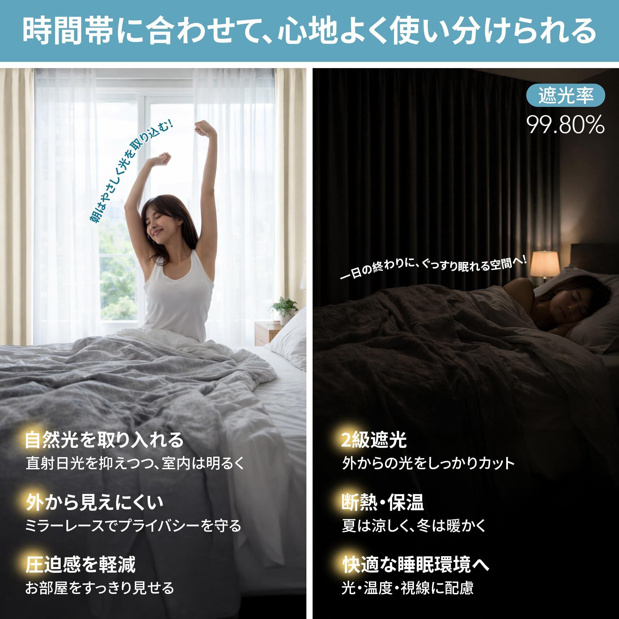 【高遮光・快眠サポート】 3層構造の高密度ポリエステル生地が、最大99%の遮光効果を実現。外光や街灯のまぶしさをしっかりカットし、上質な眠りをサポートします。