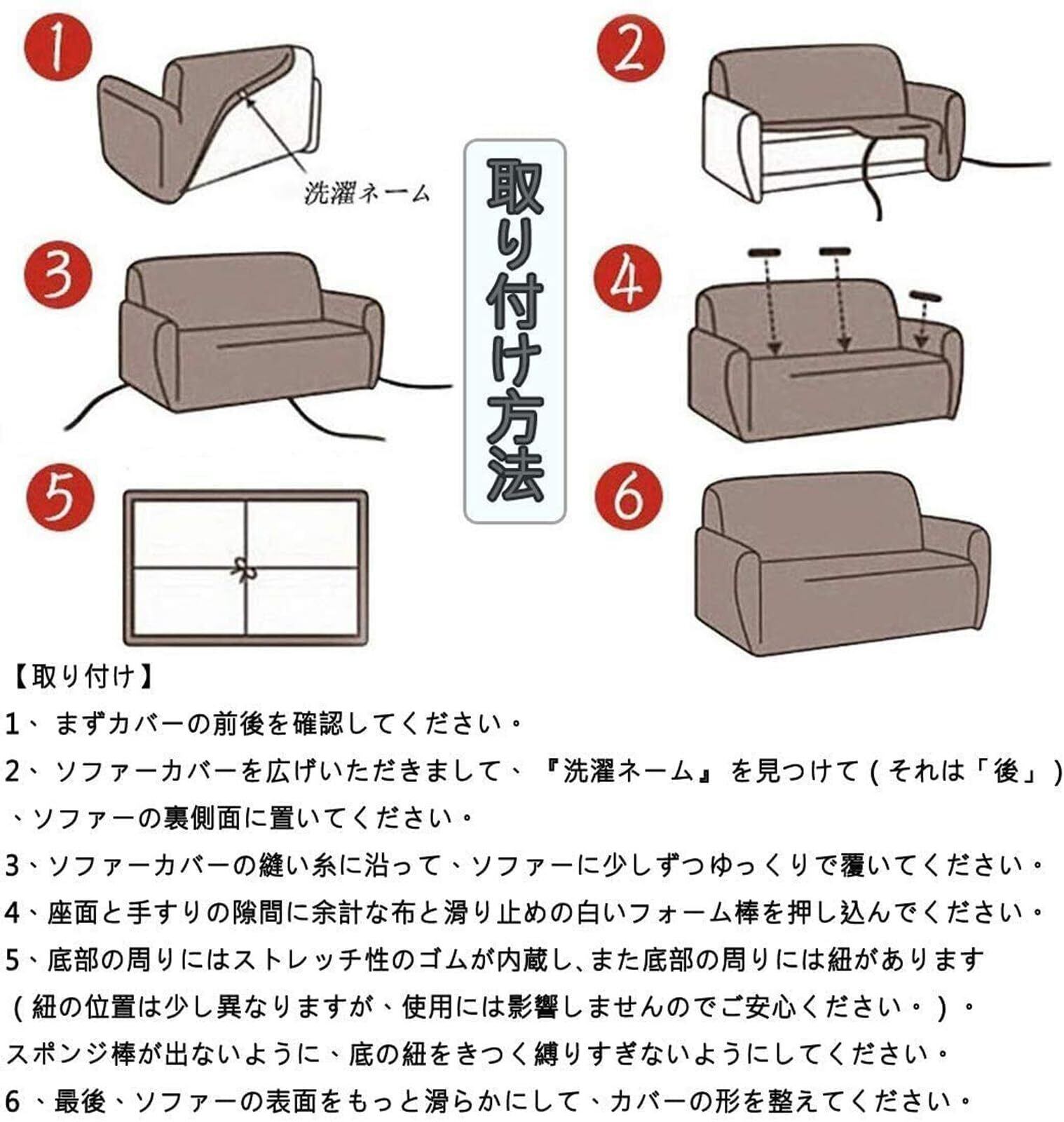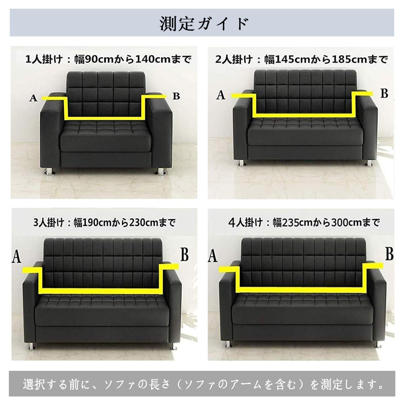 【サイズ】3人掛け:190-230cm。パッケージにあるもの:ソファーカバー、クッションカバー2枚付、スポンジ棒。底部の周りにはストレッチ性のゴムが内蔵し、またリボンでカバーをしかっりに固定できます。スポンジ棒が出ないように、底の紐をきつく縛りすぎないようにしてください。ソファの長さが2つのサイズの間にある場合は、大きい方を選択することをお勧めします。225cmは4人掛けを選択してください。
