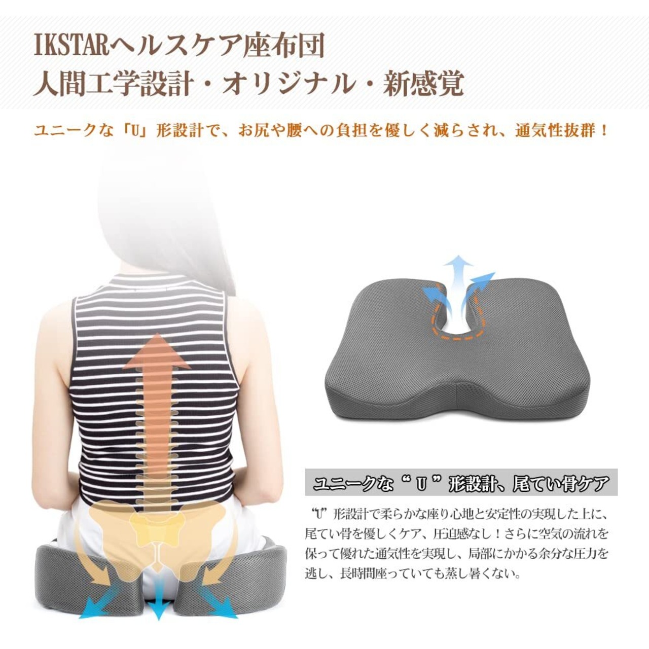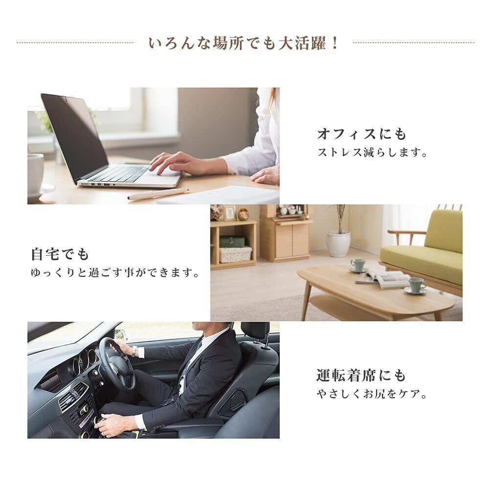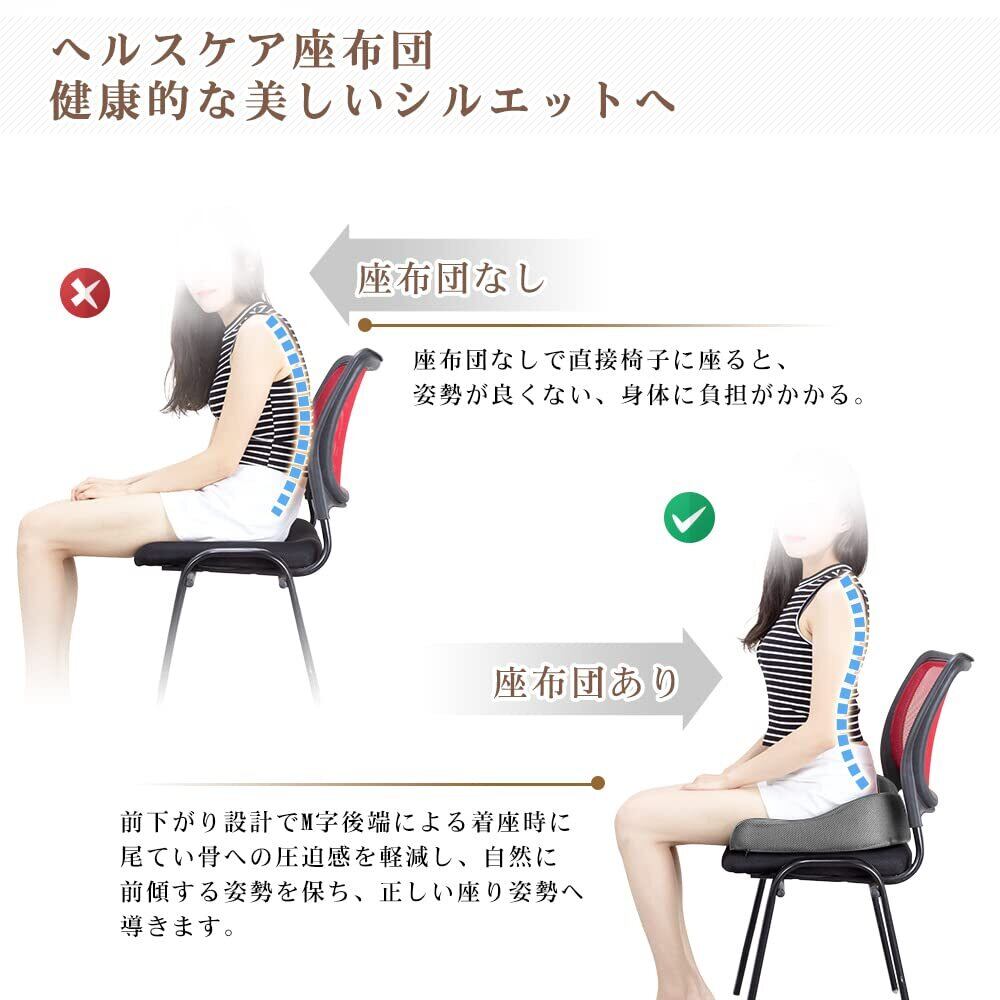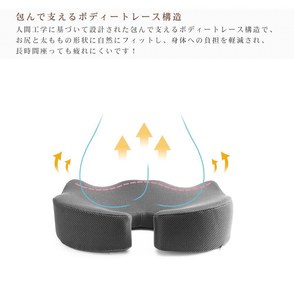 【お尻を包んで支える立体設計】やや凹みで両側は自然にお尻にフィットし、お尻にかかる圧力を分散します。【前端はW字型デザイン】両側はお尻の圧力をよく吸収します。自然にお尻を合わせて優しく包み込んで、フィット感抜群。【後端はU字型デザイン】 ユニークなU型構造で尾てい骨など弱い部位を避け、従来のクッションよりもたらす尾椎のあっぱく感という欠点を改良した。座った姿勢から尾骨にかかる圧力を軽減し、 尾てい骨を優しくケアし、座り心地良いです。また、この独自の設計により、クッションの通気性が良くなり、長時間座っていても蒸れにくくなります。